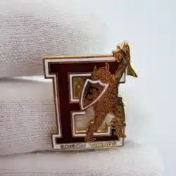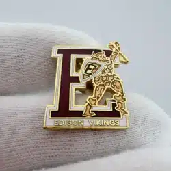 This Edison High School Vikings enamel lapel hat pin showcases a bold red letter ‘E’ prominently displayed, with ‘Edison Vikings’ elegantly positioned below it in crisp lettering. The contrast between the rich red enamel and the polished gold tone metal gives the piece a sharp, eye catching presentation that stands out on a jacket, hat, or lanyard.