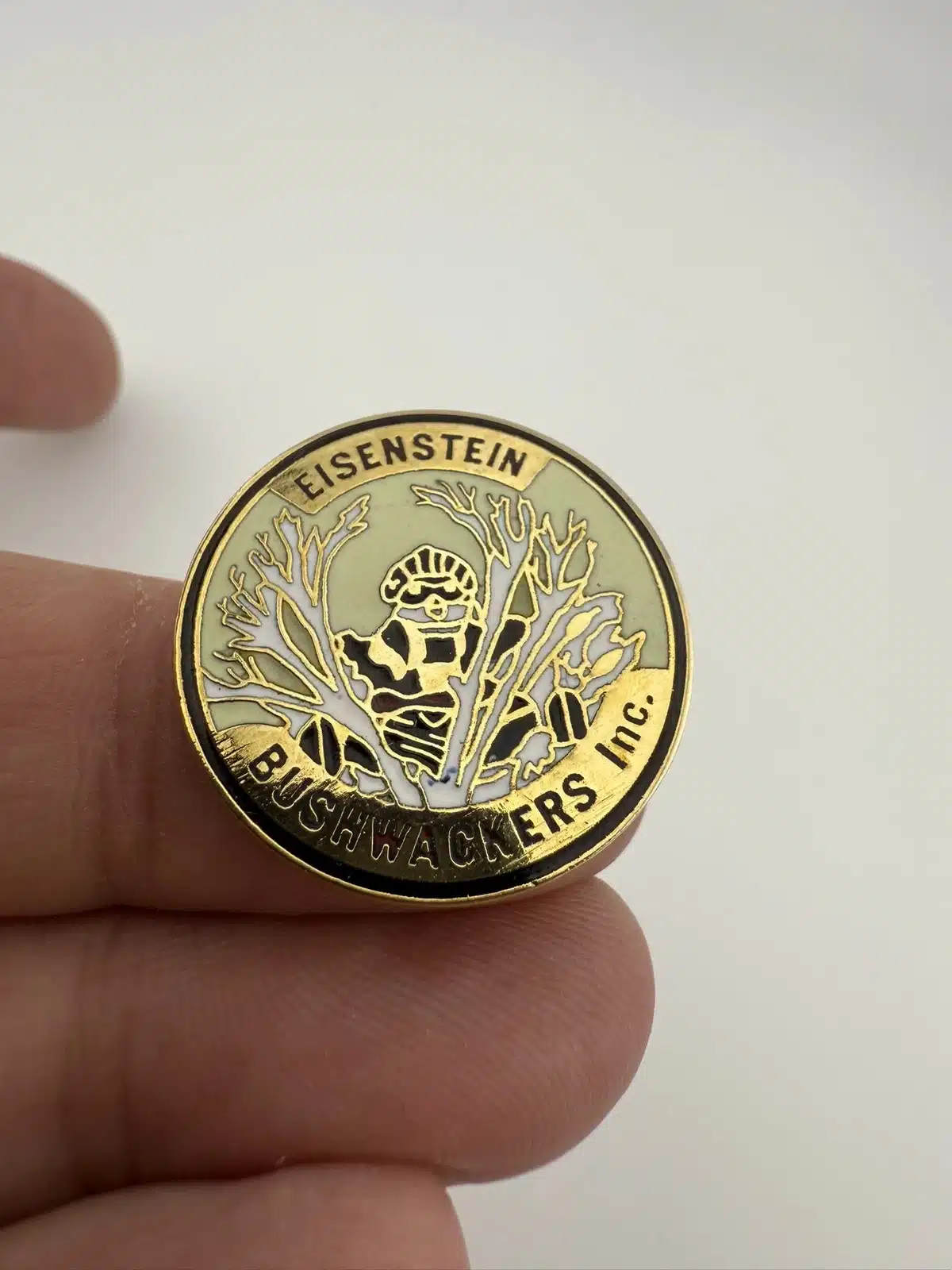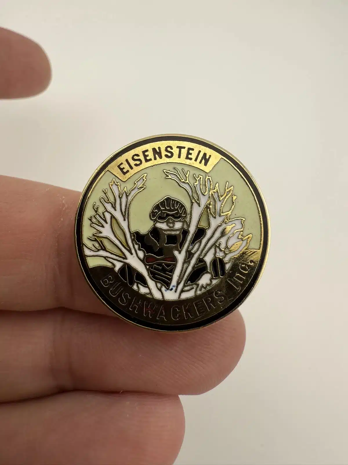 This pin features a detailed depiction of a snowmobiler stealthily concealed behind a tree, representing the adventurous spirit of winter sports. It commemorates the Eisenstein Bushwackers Inc, a Wisconsin Snowmobile Club known for promoting snowmobiling and outdoor activities in the region.
