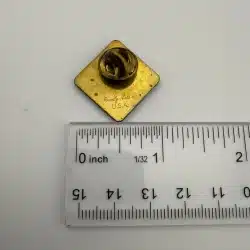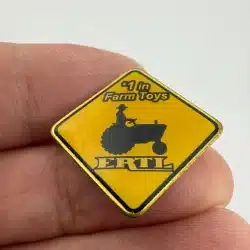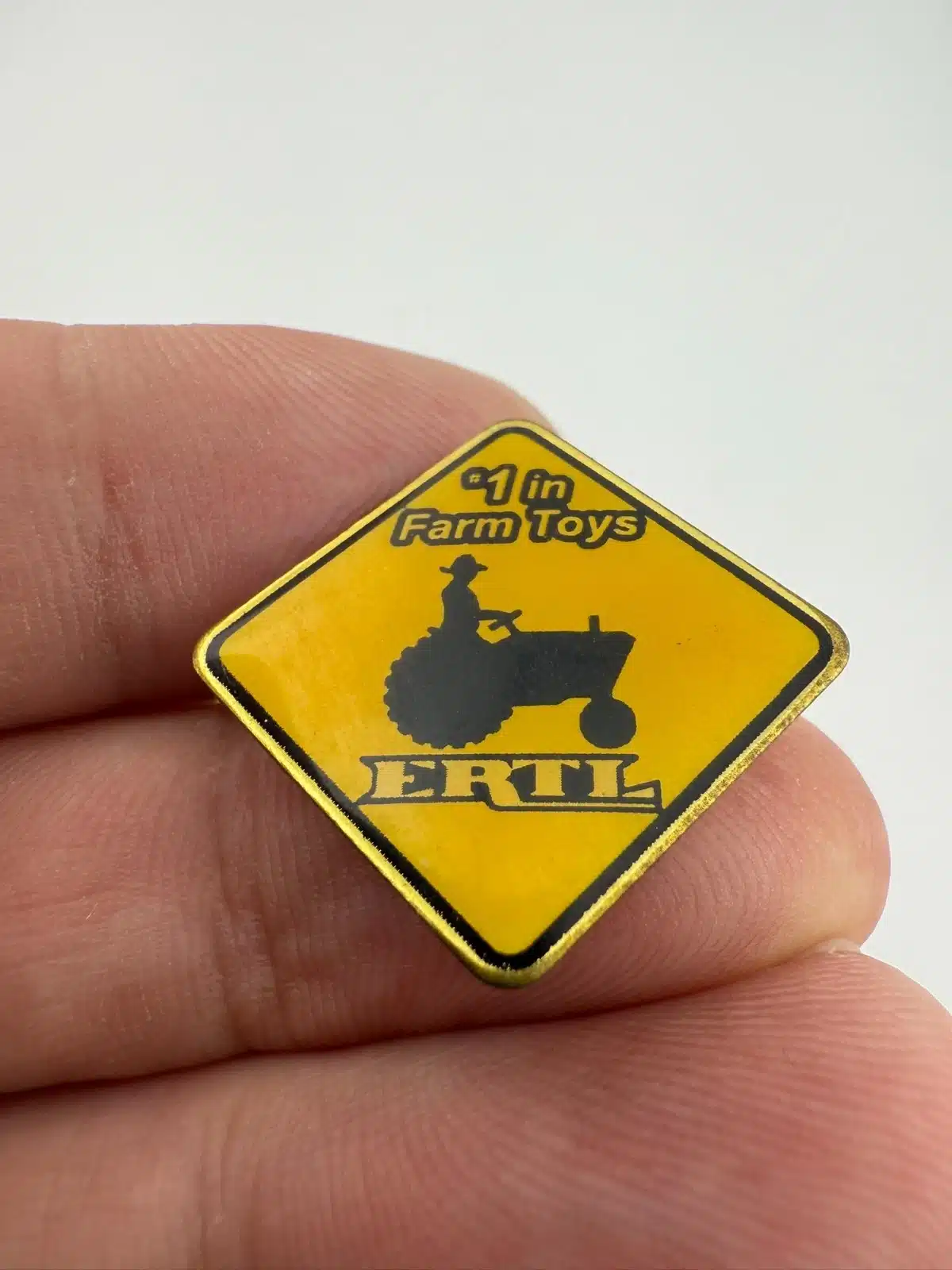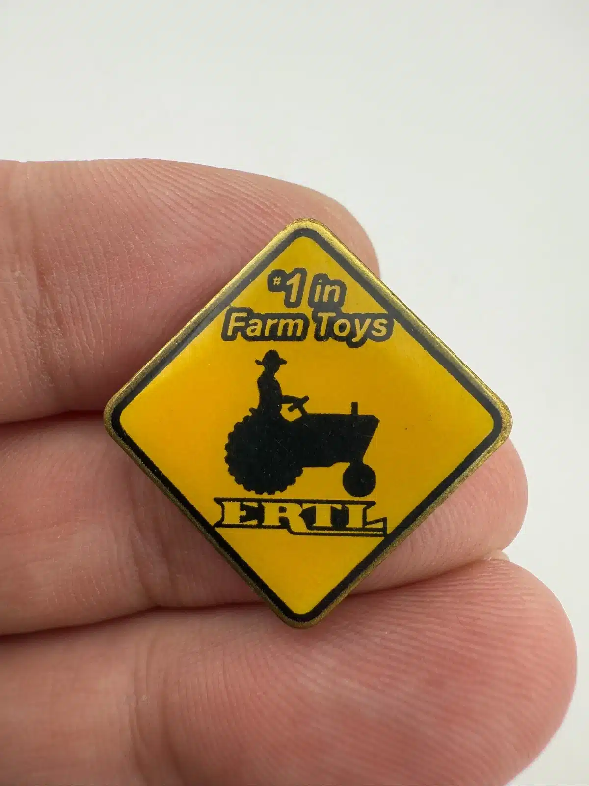 Fun ERTL Farm Toys pin in the shape of a yellow road sign. It reads “#1 in Farm Toys.”