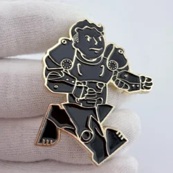 This pin showcases Fallout Boy in dynamic motion, clad in iconic power armor, capturing the essence of the beloved video game series. The black enamel is elegantly contrasted by gold tone highlights, creating a striking visual representation of the post-apocalyptic adventure.