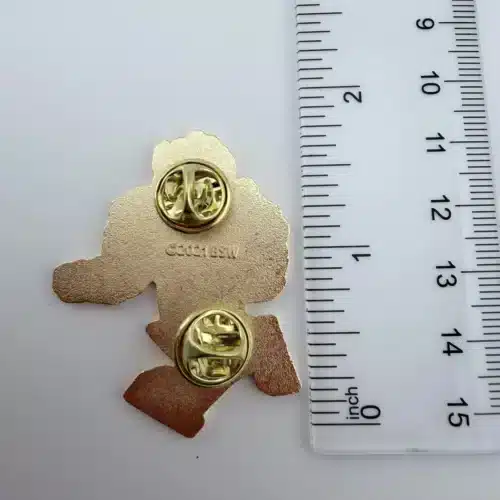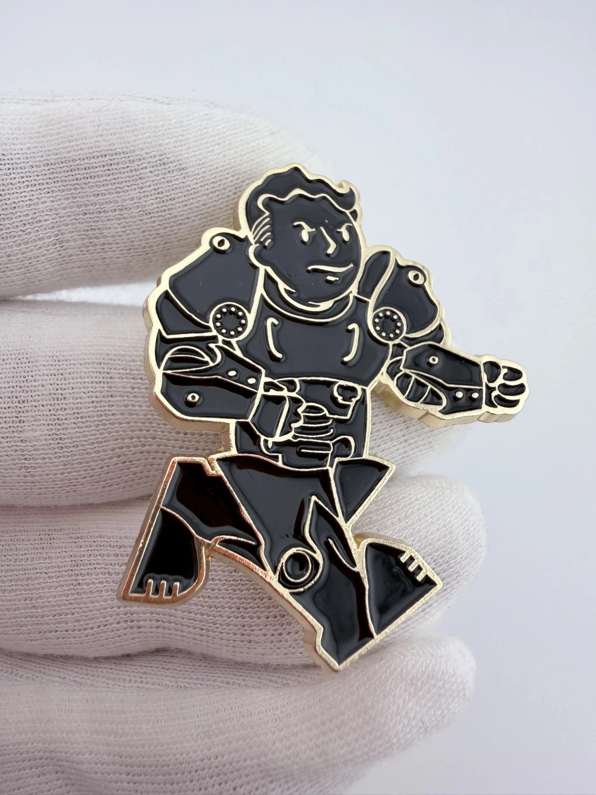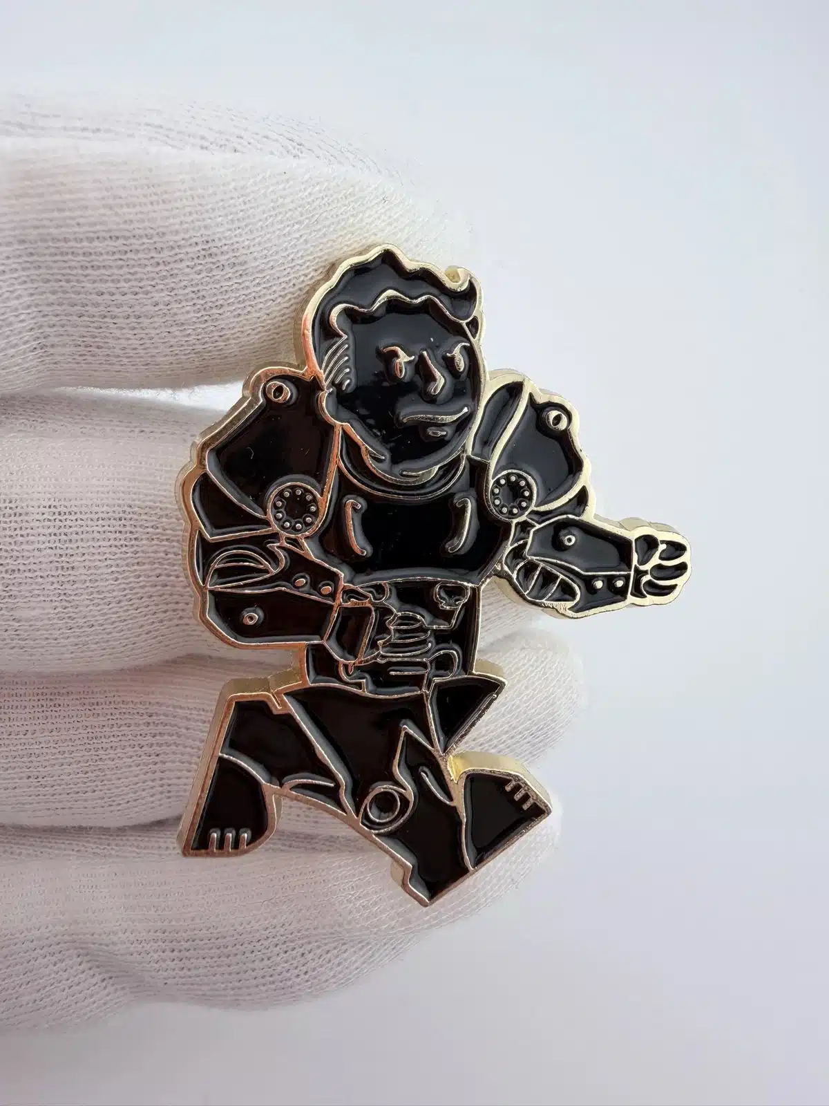 This pin showcases Fallout Boy in dynamic motion, clad in iconic power armor, capturing the essence of the beloved video game series. The black enamel is elegantly contrasted by gold tone highlights, creating a striking visual representation of the post-apocalyptic adventure.