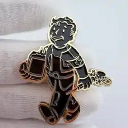 This collectible pin features the iconic Fallout boy, depicted walking while carrying two items, with a medic cross prominently displayed on his arm. The design is rendered in black enamel with gold tone highlights, capturing the retro-futuristic aesthetic of the Fallout video game series, which is known for its unique blend of post-apocalyptic themes and 1950s Americana.
