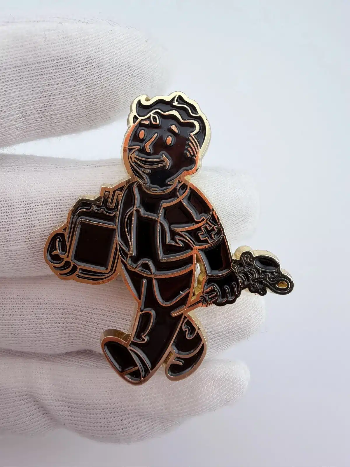 This collectible pin features the iconic Fallout boy, depicted walking while carrying two items, with a medic cross prominently displayed on his arm. The design is rendered in black enamel with gold tone highlights, capturing the retro-futuristic aesthetic of the Fallout video game series, which is known for its unique blend of post-apocalyptic themes and 1950s Americana.
