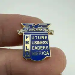 This FBLA Future Business Leaders of America pin features the words ‘Service’, ‘Education’, and ‘Progress’ prominently displayed, symbolizing the core values of the organization. The design is accented by a striking eagle at the top, all set against a vibrant blue enamel background that enhances its visual appeal.