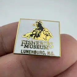 This pin features a white enamel design showcasing a graphic of fishermen, representing the Fisheries Museum of the Atlantic located in Lunenburg, Nova Scotia. It is a commemorative piece celebrating the region’s rich maritime heritage.