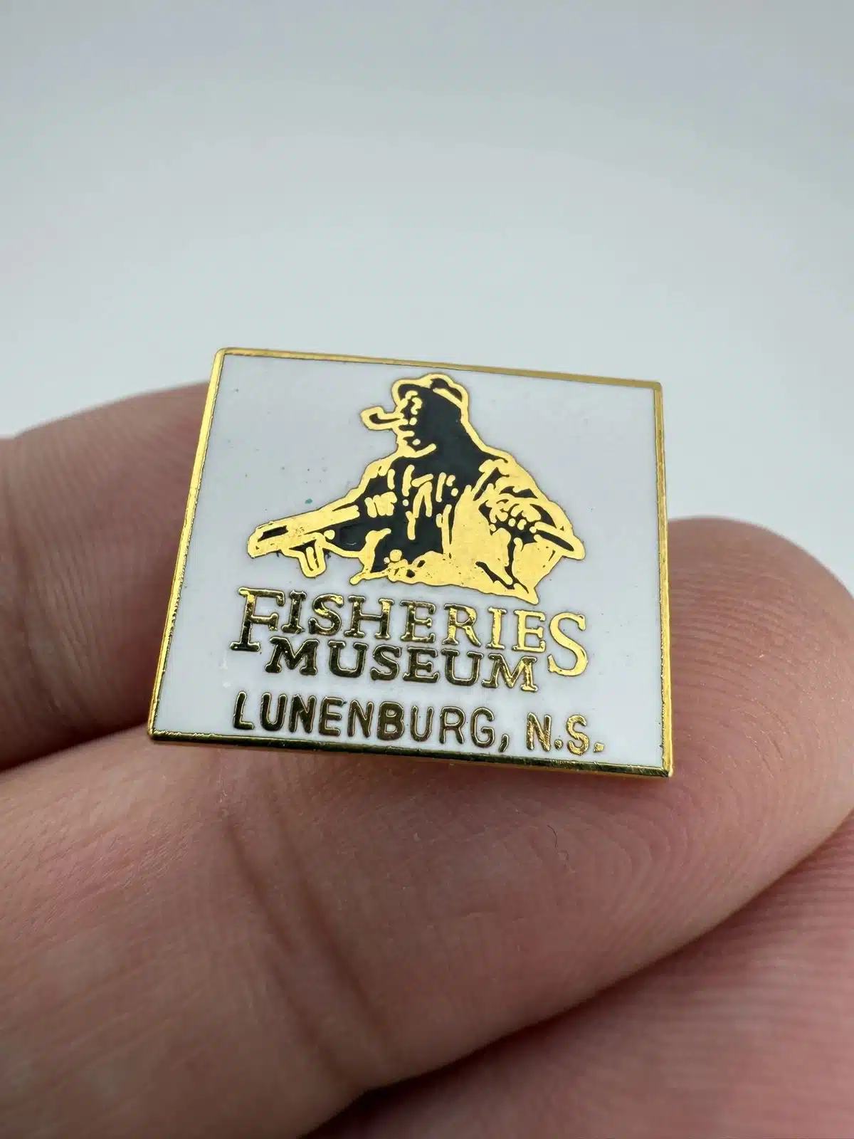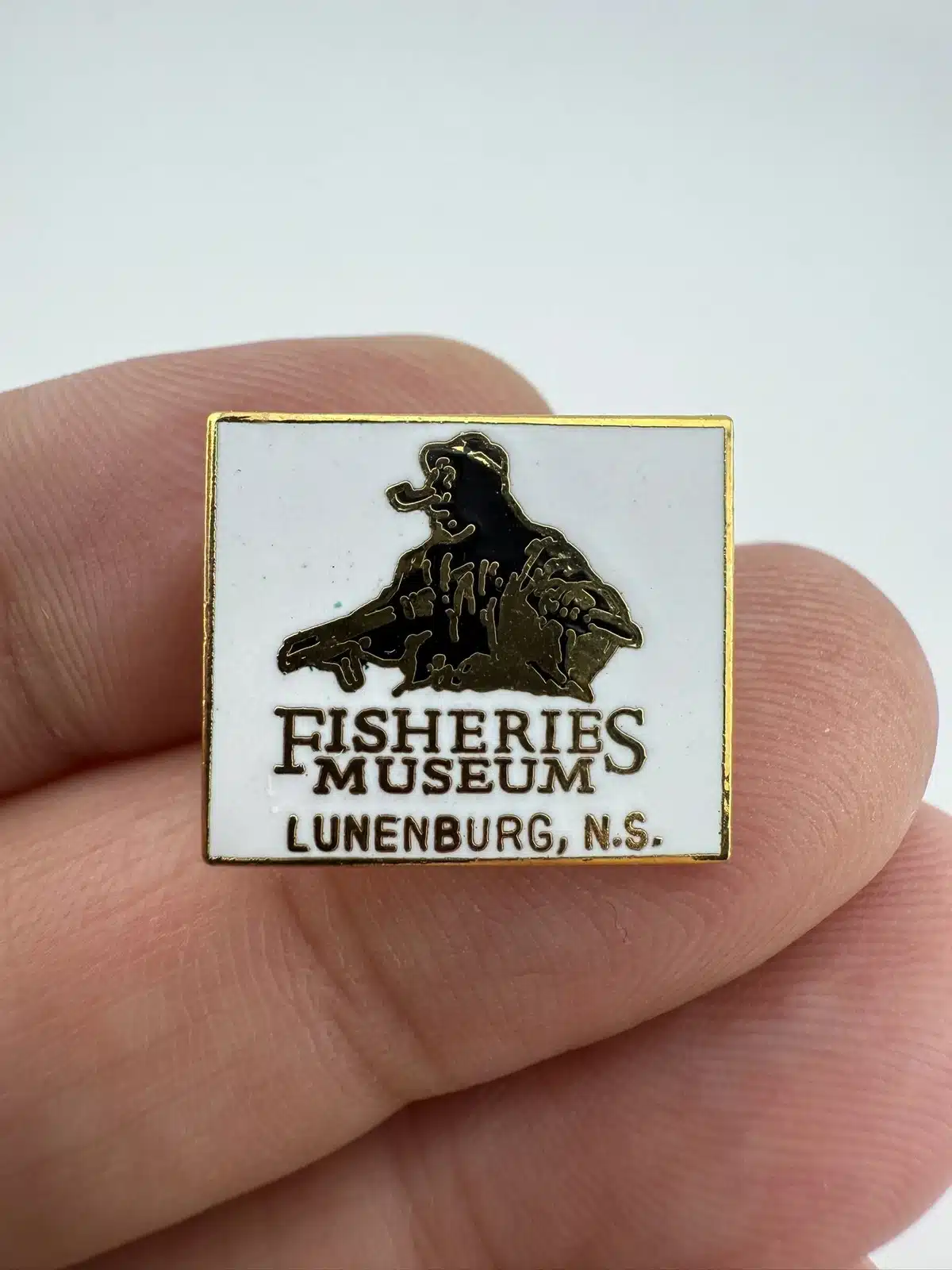 This pin features a white enamel design showcasing a graphic of fishermen, representing the Fisheries Museum of the Atlantic located in Lunenburg, Nova Scotia. It is a commemorative piece celebrating the region’s rich maritime heritage.