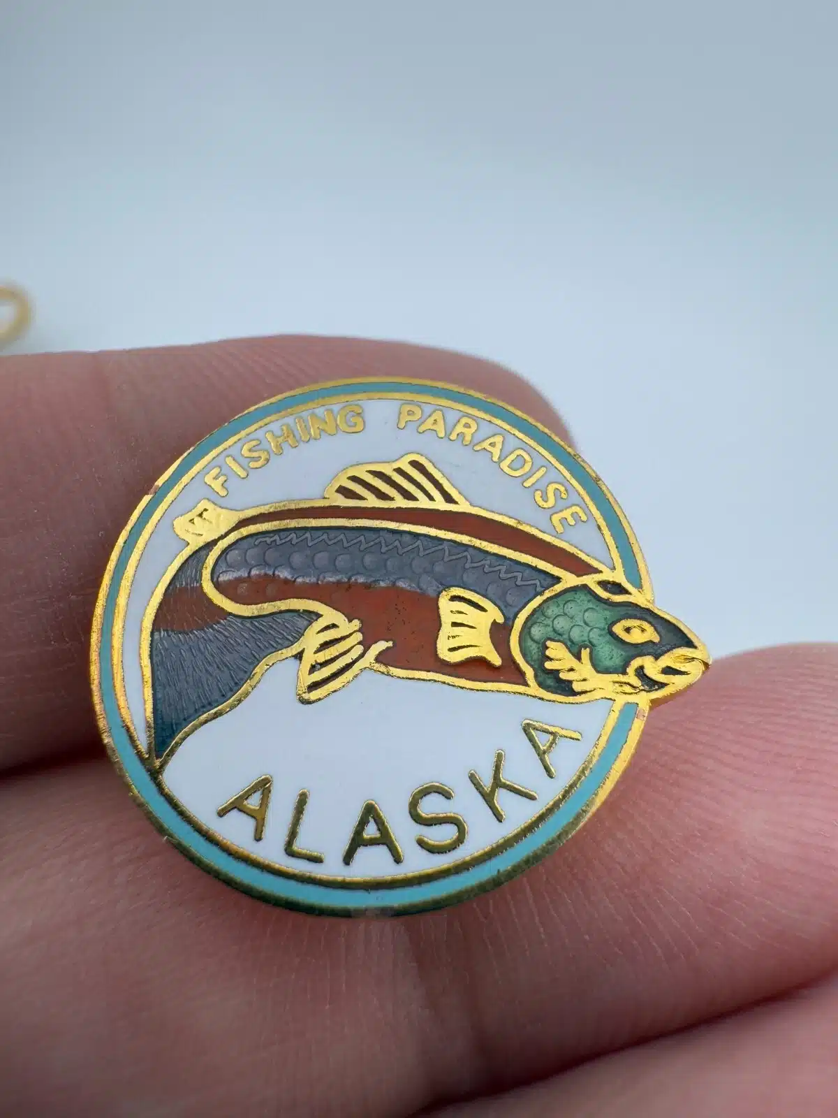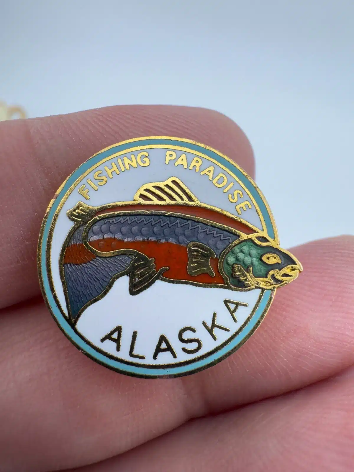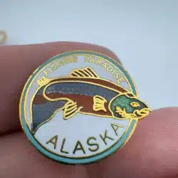 Fishing Paradise Alaska Lapel Hat Pin with Salmon – Gold Tone