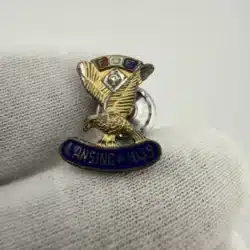 This sterling silver pin features the letters ‘FOE’ prominently displayed over red, white, and blue enamel squares, symbolizing the Fraternal Order of Eagles. In the center, a eagle with wings held high along with a stone. At the bottom, the pin is marked with ‘Lansing #1032’, indicating its affiliation with the Lansing Lodge, likely of Michigan.