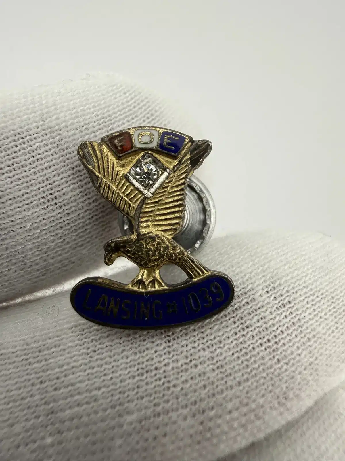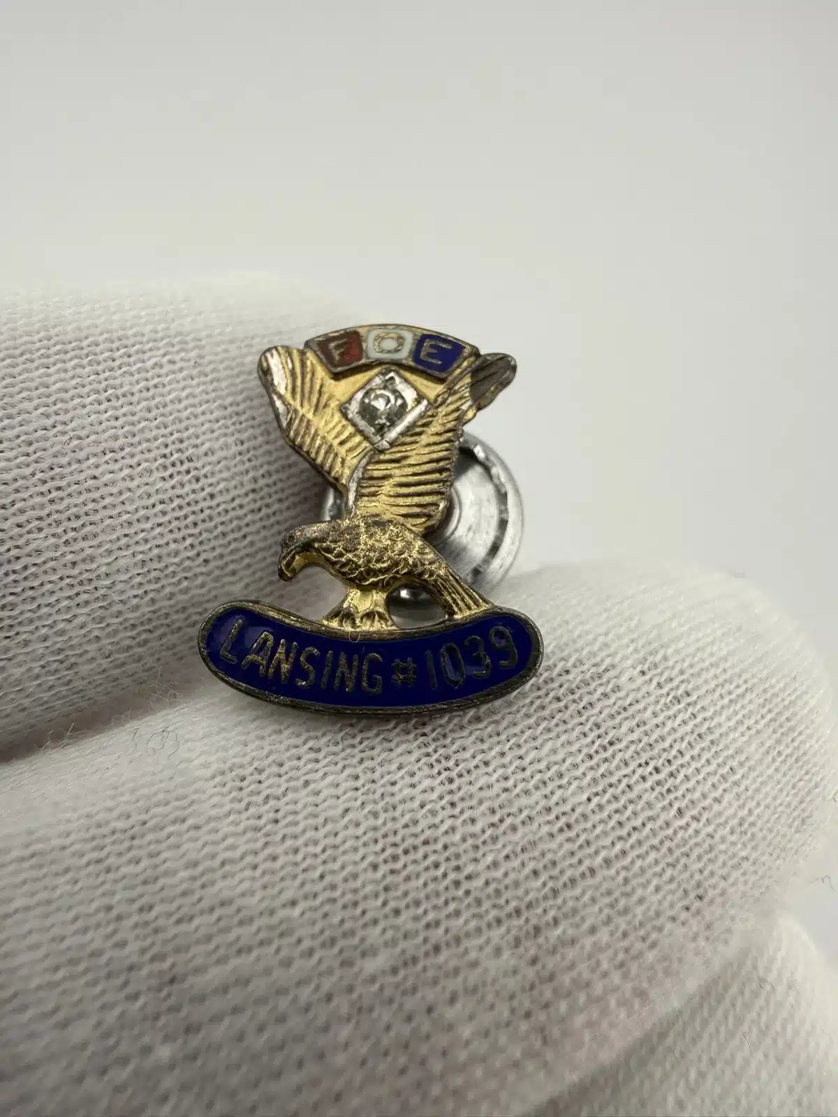 This sterling silver pin features the letters ‘FOE’ prominently displayed over red, white, and blue enamel squares, symbolizing the Fraternal Order of Eagles. In the center, a eagle with wings held high along with a stone. At the bottom, the pin is marked with ‘Lansing #1032’, indicating its affiliation with the Lansing Lodge, likely of Michigan.