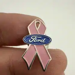 This pin features a classic pink ribbon design, symbolizing breast cancer awareness, and is adorned with the Ford Motor Company logo, representing the brand’s commitment to supporting this important cause. The combination of the iconic ribbon and the recognizable logo creates a striking piece that highlights both corporate philanthropy and health advocacy.