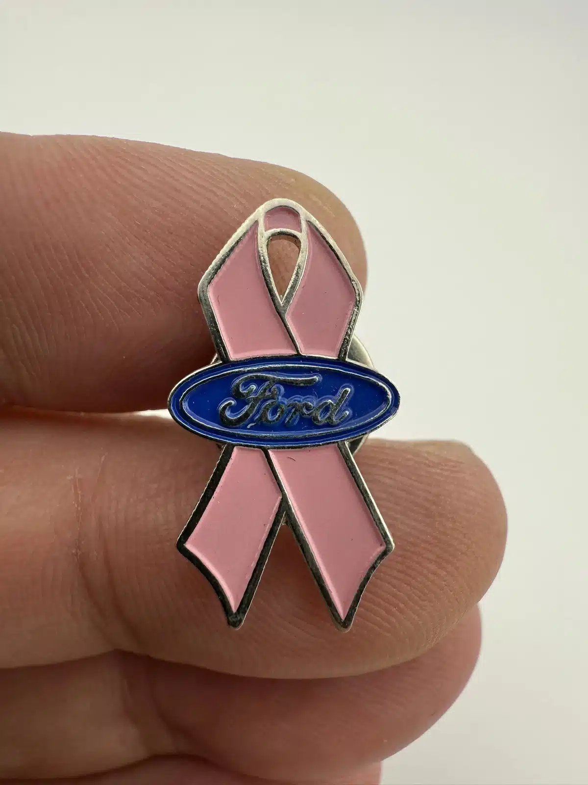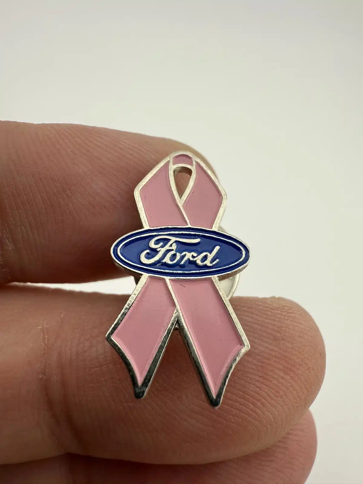 This pin features a classic pink ribbon design, symbolizing breast cancer awareness, and is adorned with the Ford Motor Company logo, representing the brand’s commitment to supporting this important cause. The combination of the iconic ribbon and the recognizable logo creates a striking piece that highlights both corporate philanthropy and health advocacy.