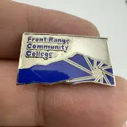 This Front Range Community College pin features a silver tone finish with blueish purple enamel highlights.