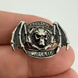 This pin features a skull at the center encircled by a motorcycle chain, with winged elements extending outward from chain. The words Freedom appear at the top and Or Death at the bottom, all set in a silver and black tone design with bold, high-contrast detailing.
