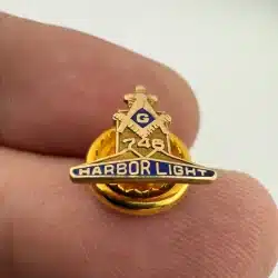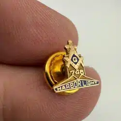 This pin represents Harbor Light Masonic Lodge No. 746 in Toledo, Ohio, part of the Freemasons, a fraternal organization with origins in the 18th century. The piece is made of 10K gold and weighs approximately 0.7 grams. Pin measures approximately 1/2 inch in width by under 1/2 inch in height.