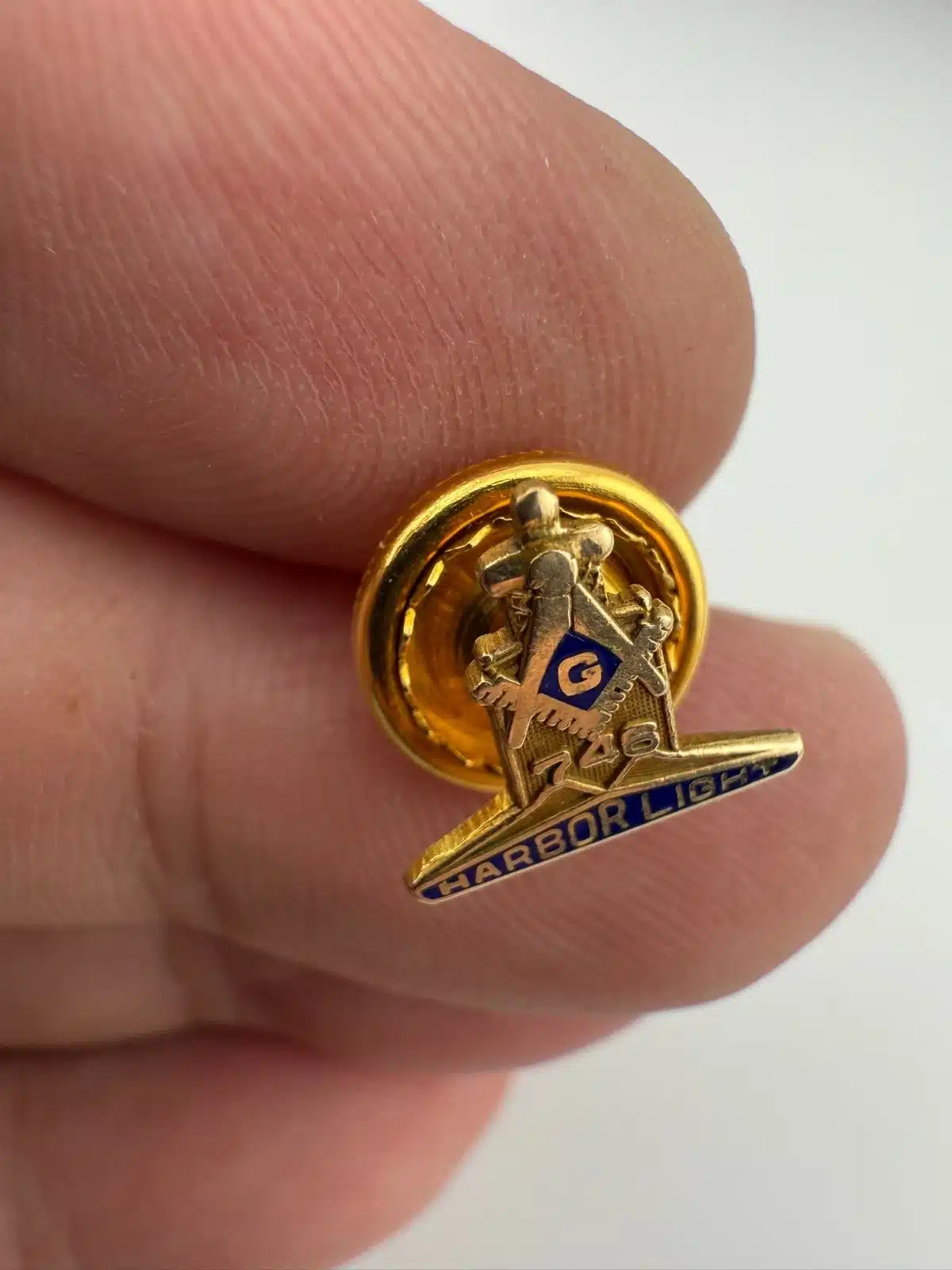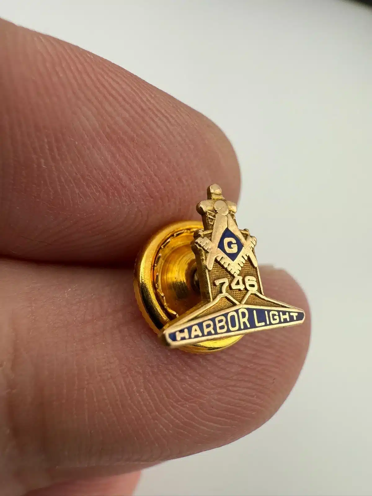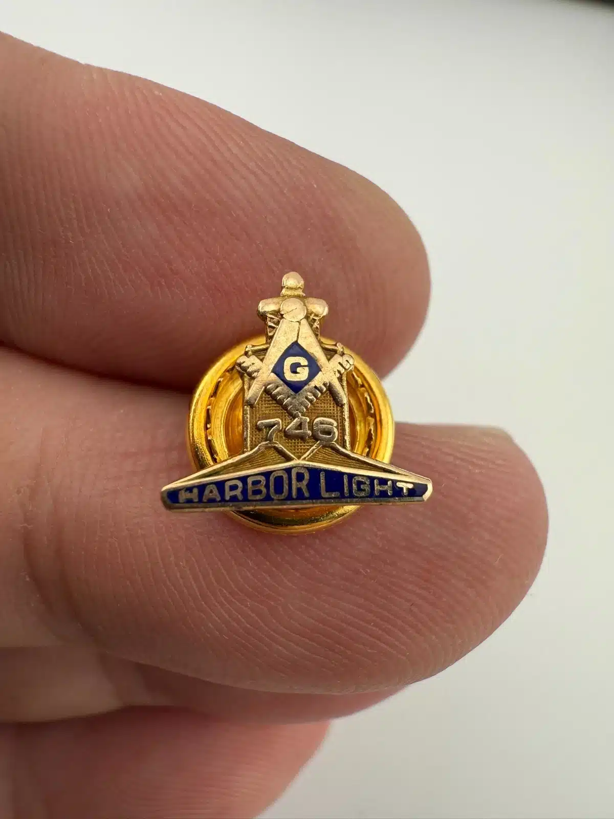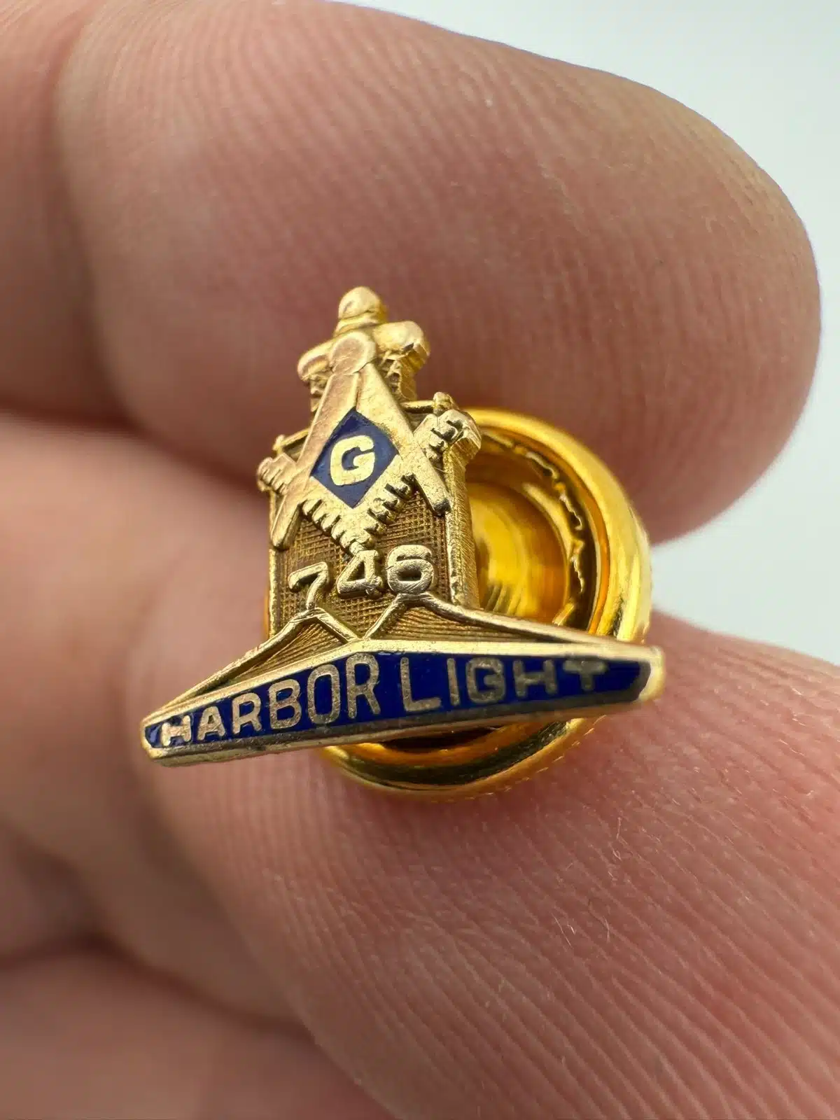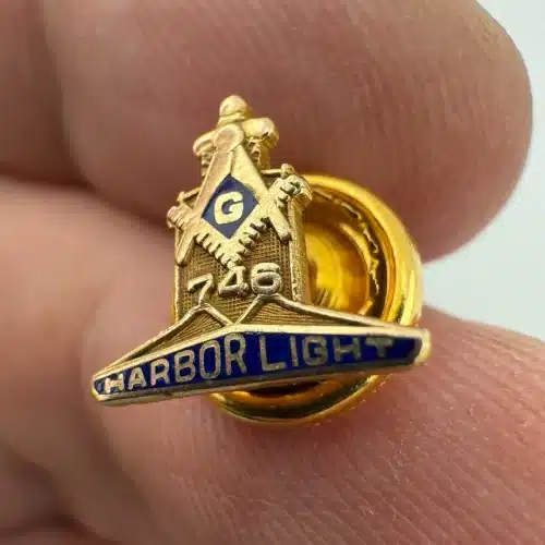 This pin represents Harbor Light Masonic Lodge No. 746 in Toledo, Ohio, part of the Freemasons, a fraternal organization with origins in the 18th century. The piece is made of 10K gold and weighs approximately 0.7 grams. Pin measures approximately 1/2 inch in width by under 1/2 inch in height.