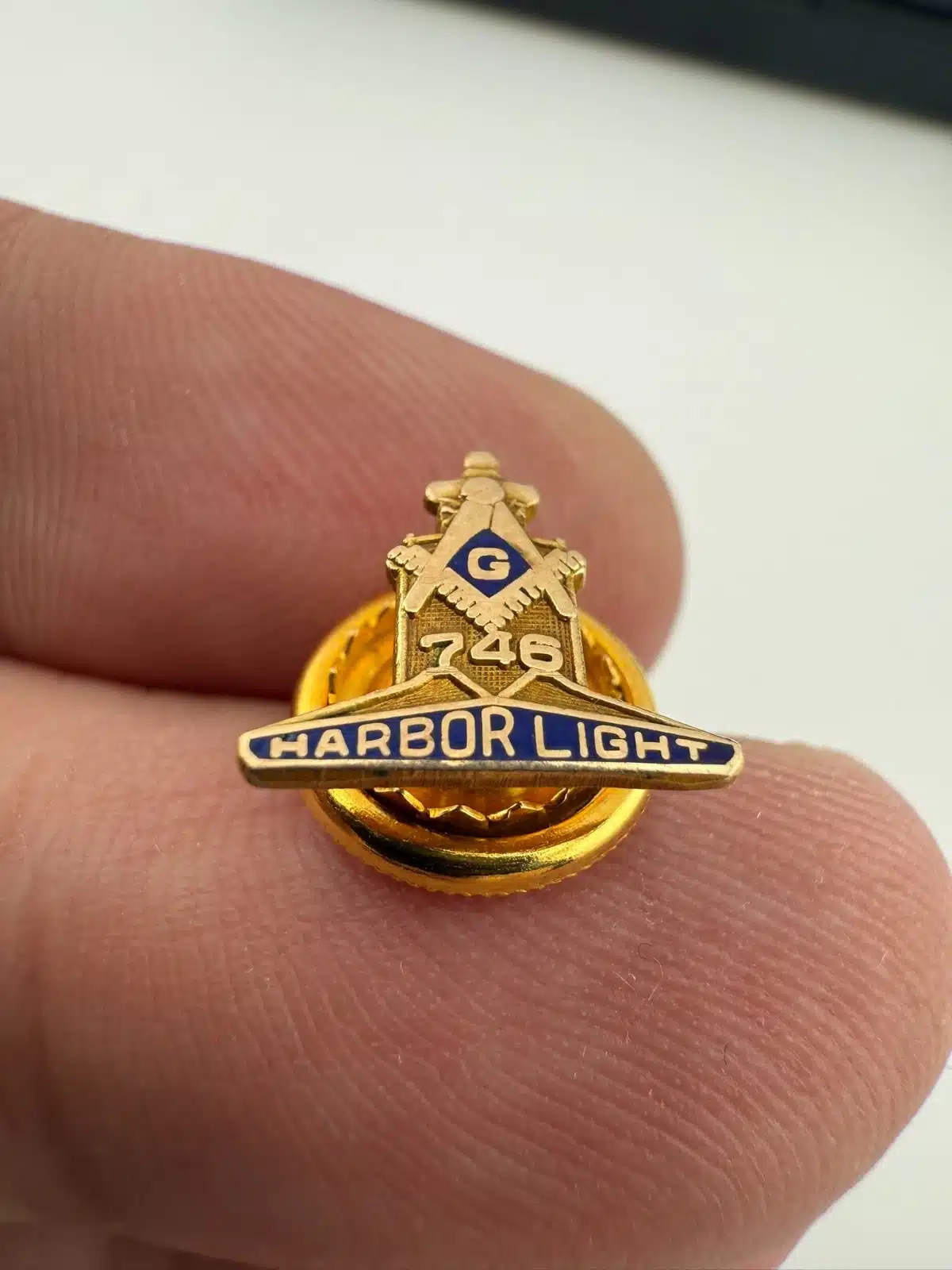 At the top of this small pin is the Masonic square and compasses symbol, with the number “746” displayed below. Beneath the number are the words “Harbor Light,” forming the wide base of the pin in a compact vertical layout.
