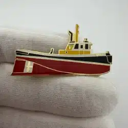 This lapel pin features a striking design of a red, black, and yellow tugboat, symbolizing the vital role these vessels play in maritime navigation and commerce. The vibrant colors and detailed craftsmanship reflect the enduring legacy of tugboats in American waterways, particularly in coastal port regions.
