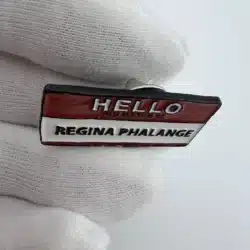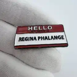 This pin features a classic ‘Hello, My Name Is’ name tag design, prominently displaying the name ‘Regina Phalange’ in bold black letters against a bright white background. The use of black enamel adds a sleek finish, making it a vibrant representation of the iconic character from the television series Friends.