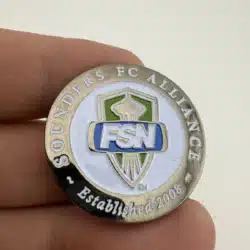 This pin features the logo of the Seattle Sounders FC which is adorned with the Fox Sports Net (FSN) branding. The design captures the vibrant colors and spirit of the team, making it a notable piece for fans of the Major League Soccer franchise or FSN.