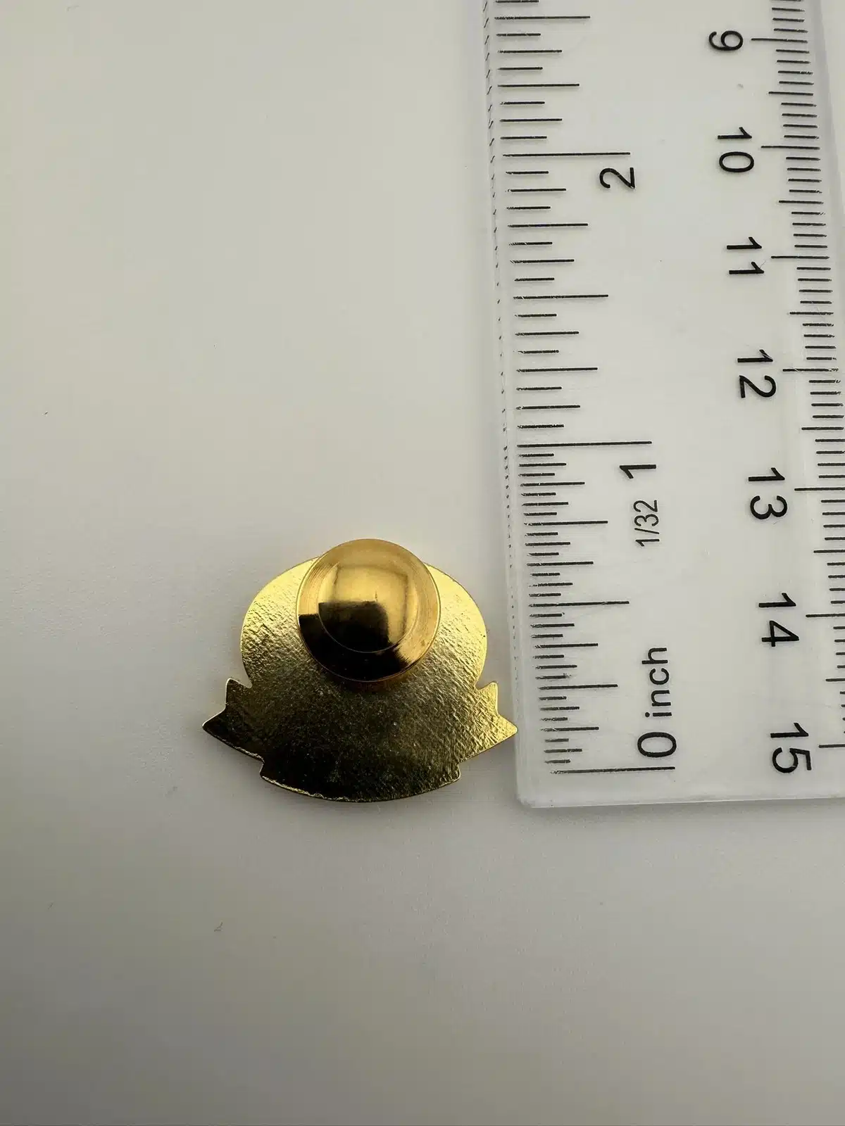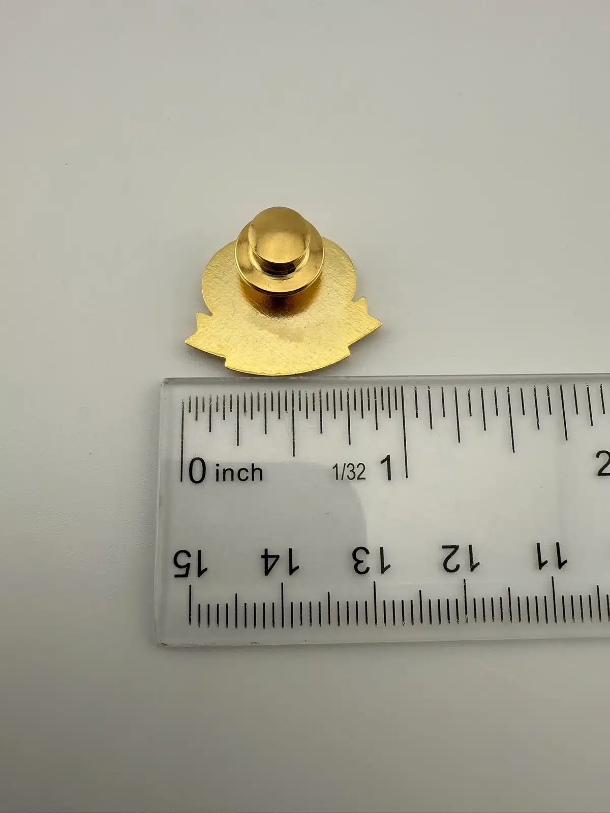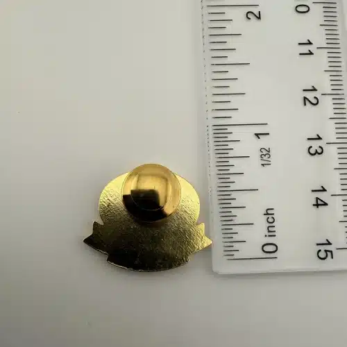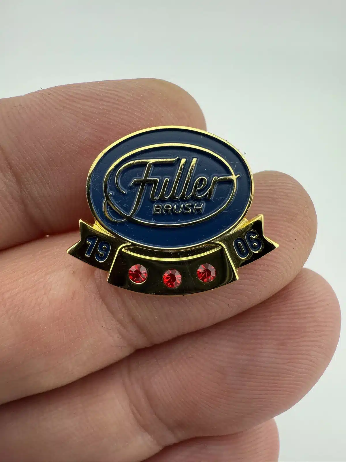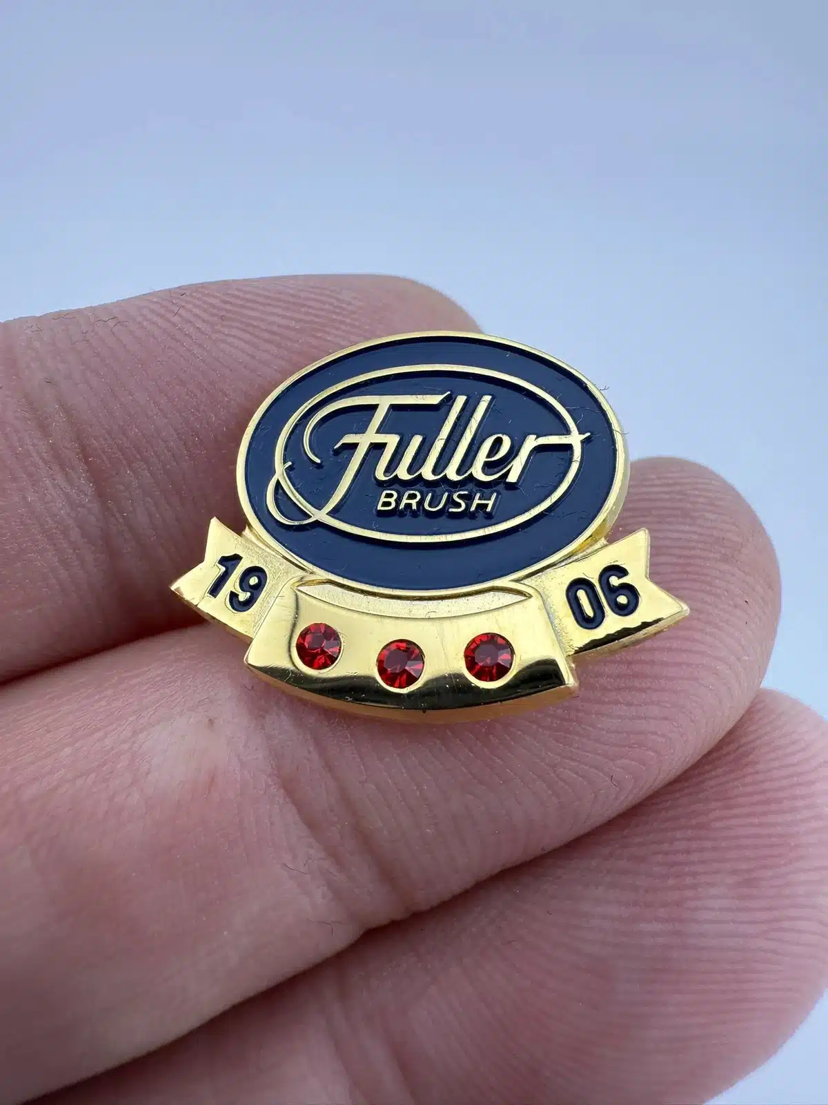 Fuller Brush Company employee service award pin – most likely 15 years. Features 3 small red rhinestones or similar and the company logo above.