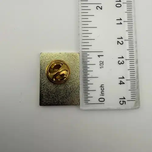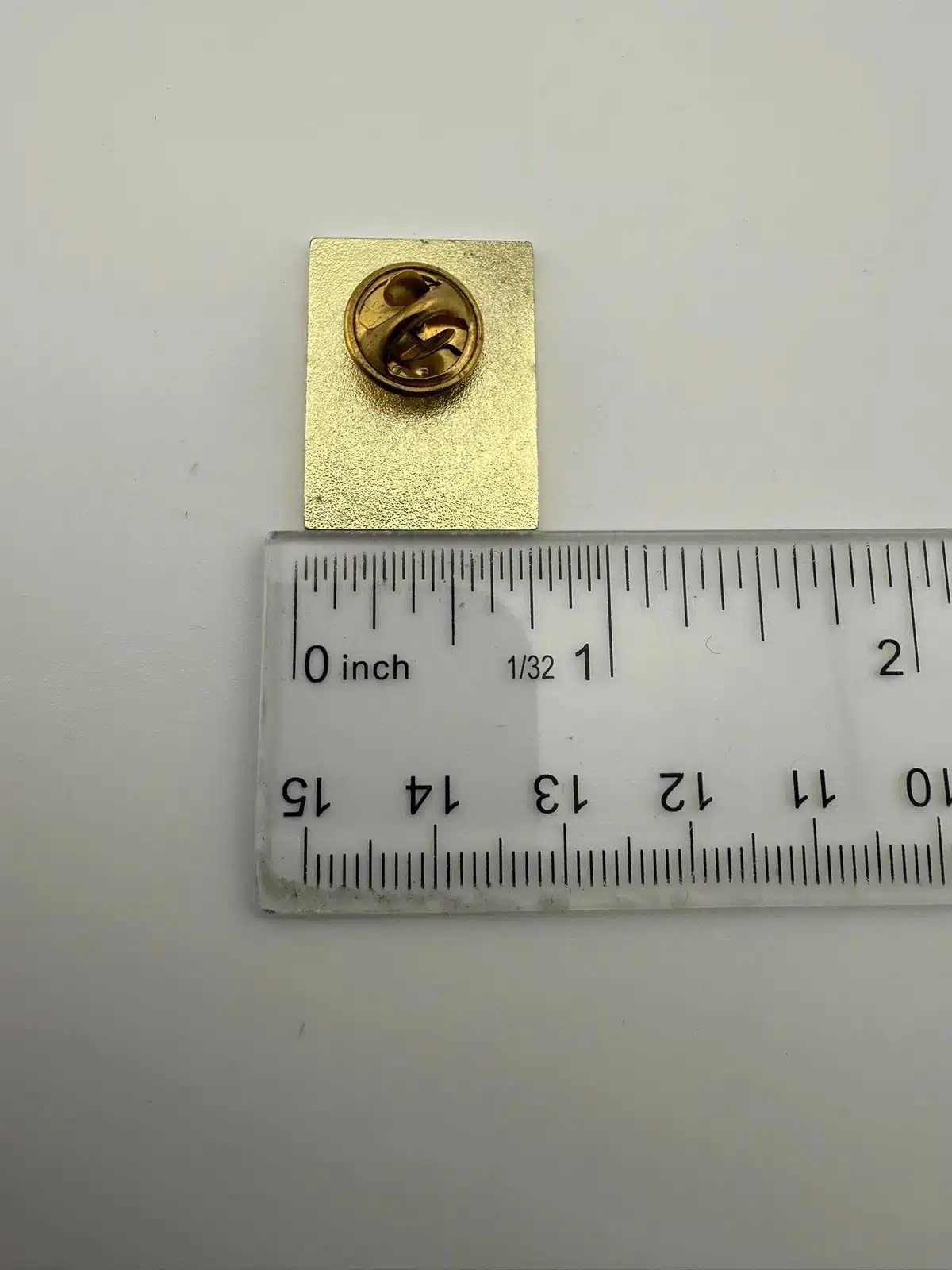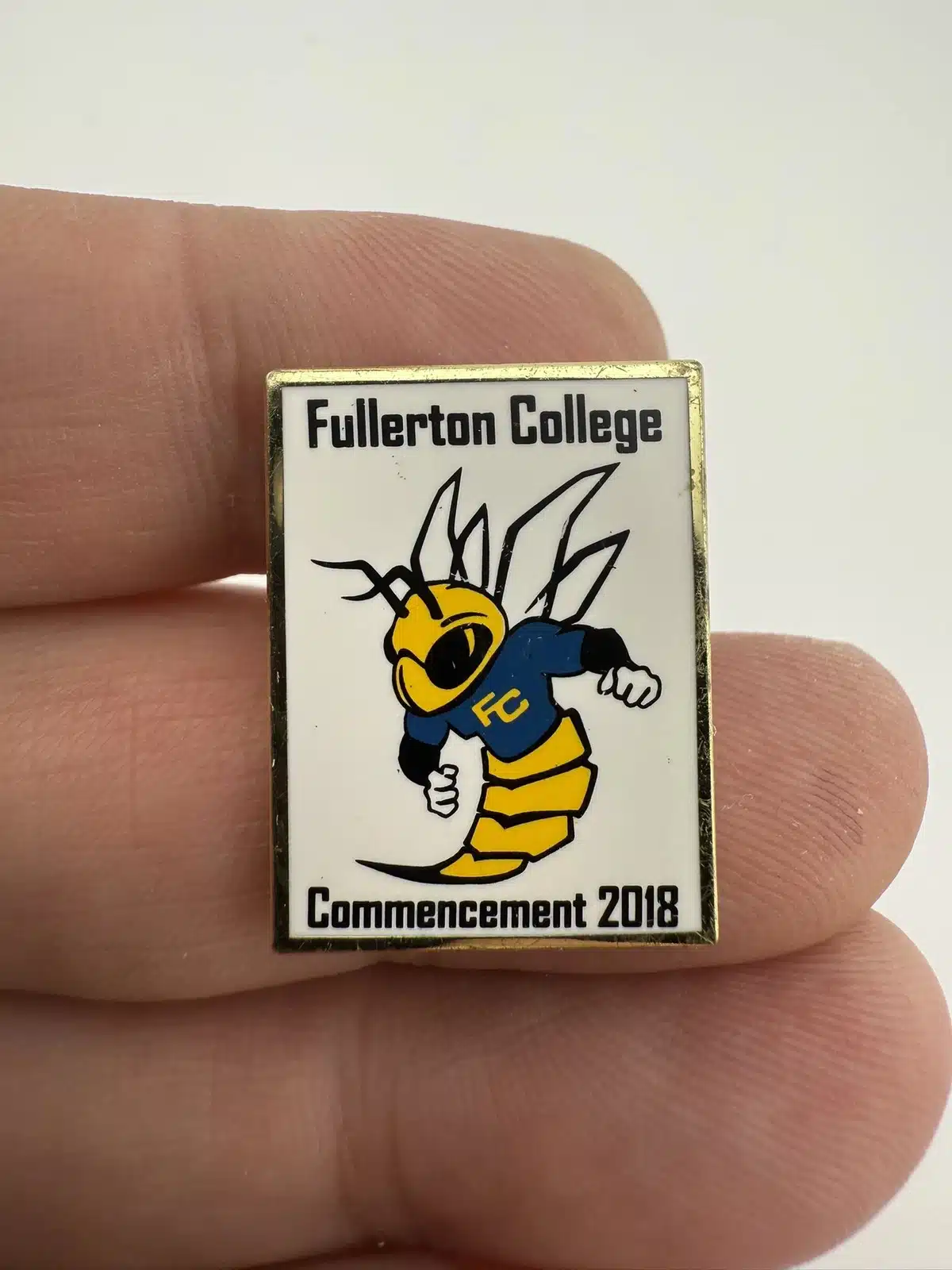 This 2018 graduation commencement pin from Fullerton College features their mascot: Buzzy The Hornet. Fullerton College is located in Fullerton, California which is part of Orange County.