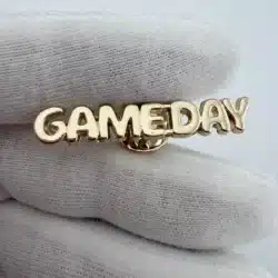 This Gameday Text Lapel Hat Pin showcases the word ‘GAMEDAY’ in capitalized, bubbly font, rendered in an eye-catching gold tone. The design captures the excitement and spirit of football culture, making it a vibrant addition to any collection.