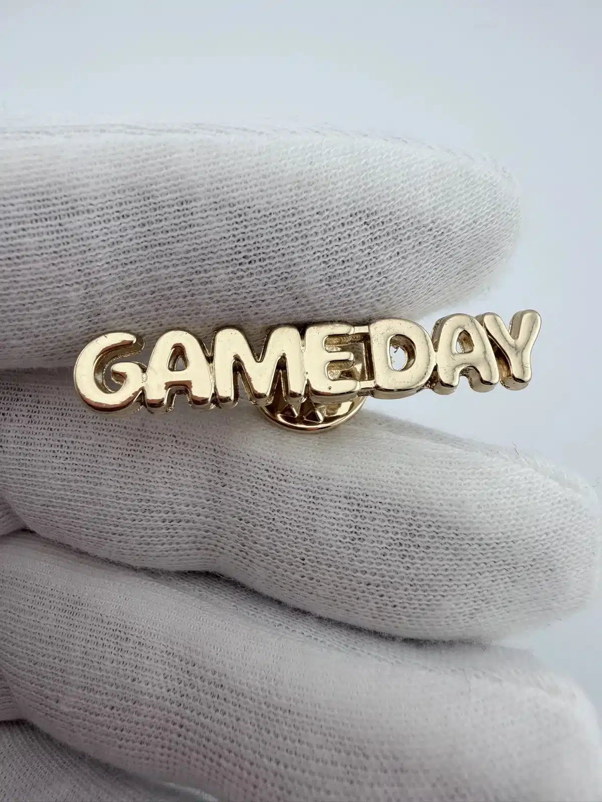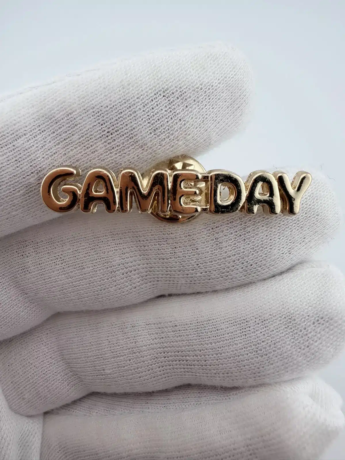 This Gameday Text Lapel Hat Pin showcases the word ‘GAMEDAY’ in capitalized, bubbly font, rendered in an eye-catching gold tone. The design captures the excitement and spirit of football culture, making it a vibrant addition to any collection.