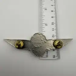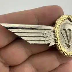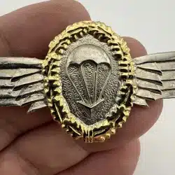 4″ wide replica of the German Armed Forces Parachutist Badge in silver and gold tones.