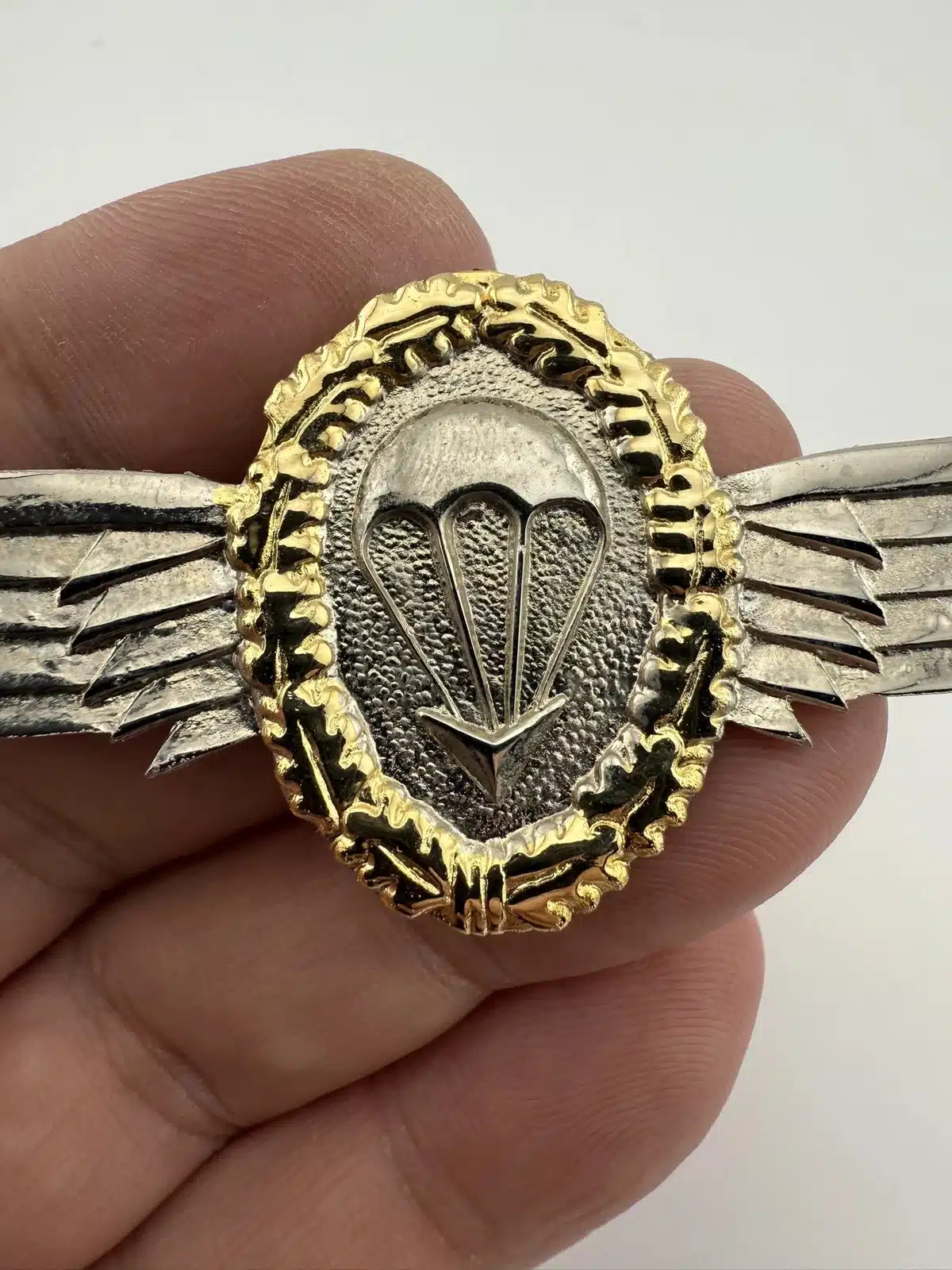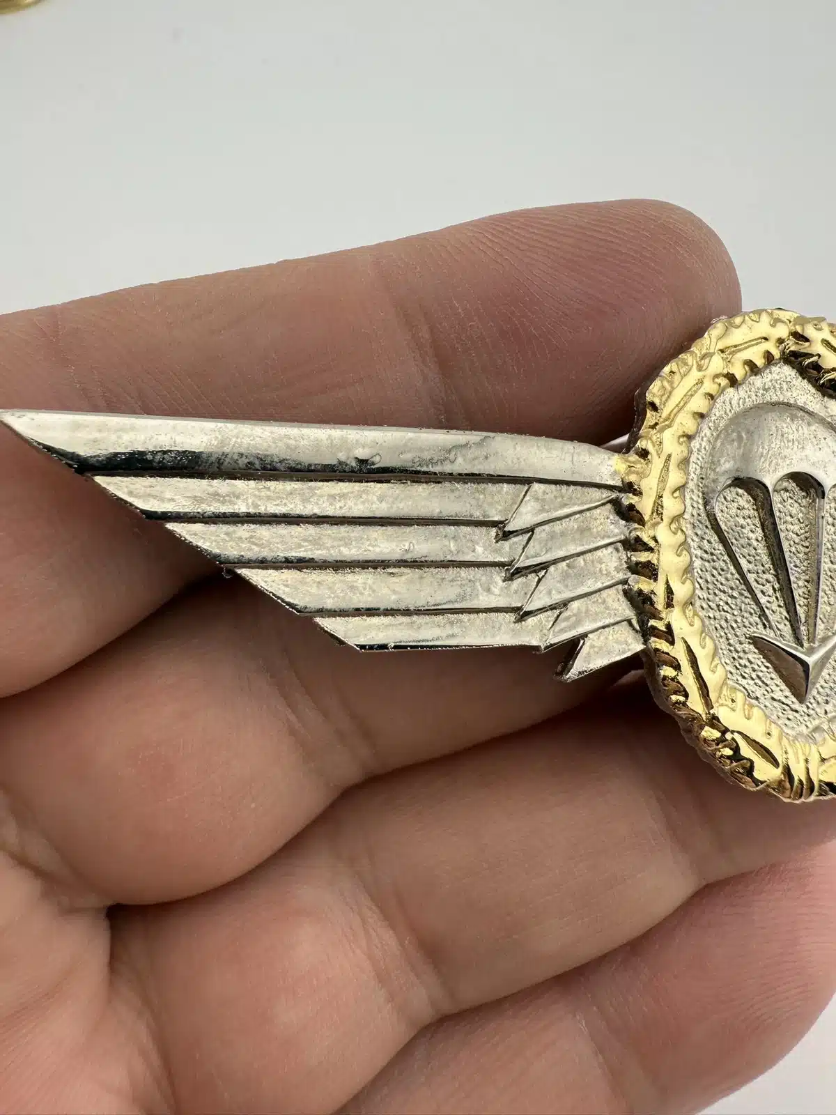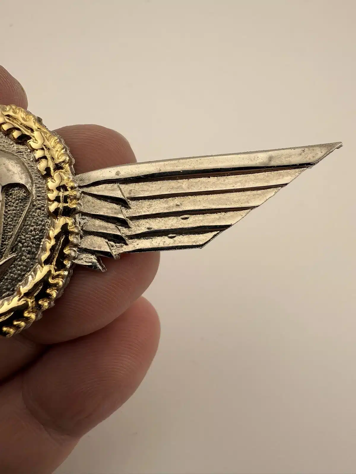 4″ wide replica of the German Armed Forces Parachutist Badge in silver and gold tones.