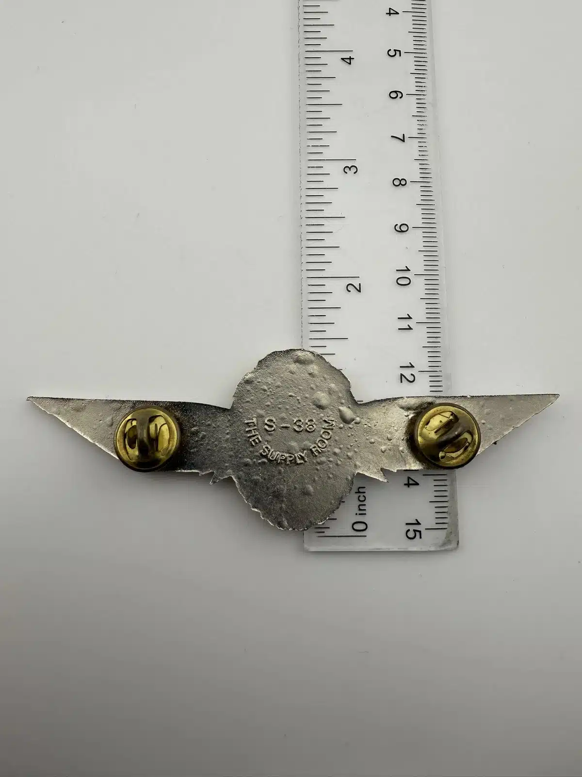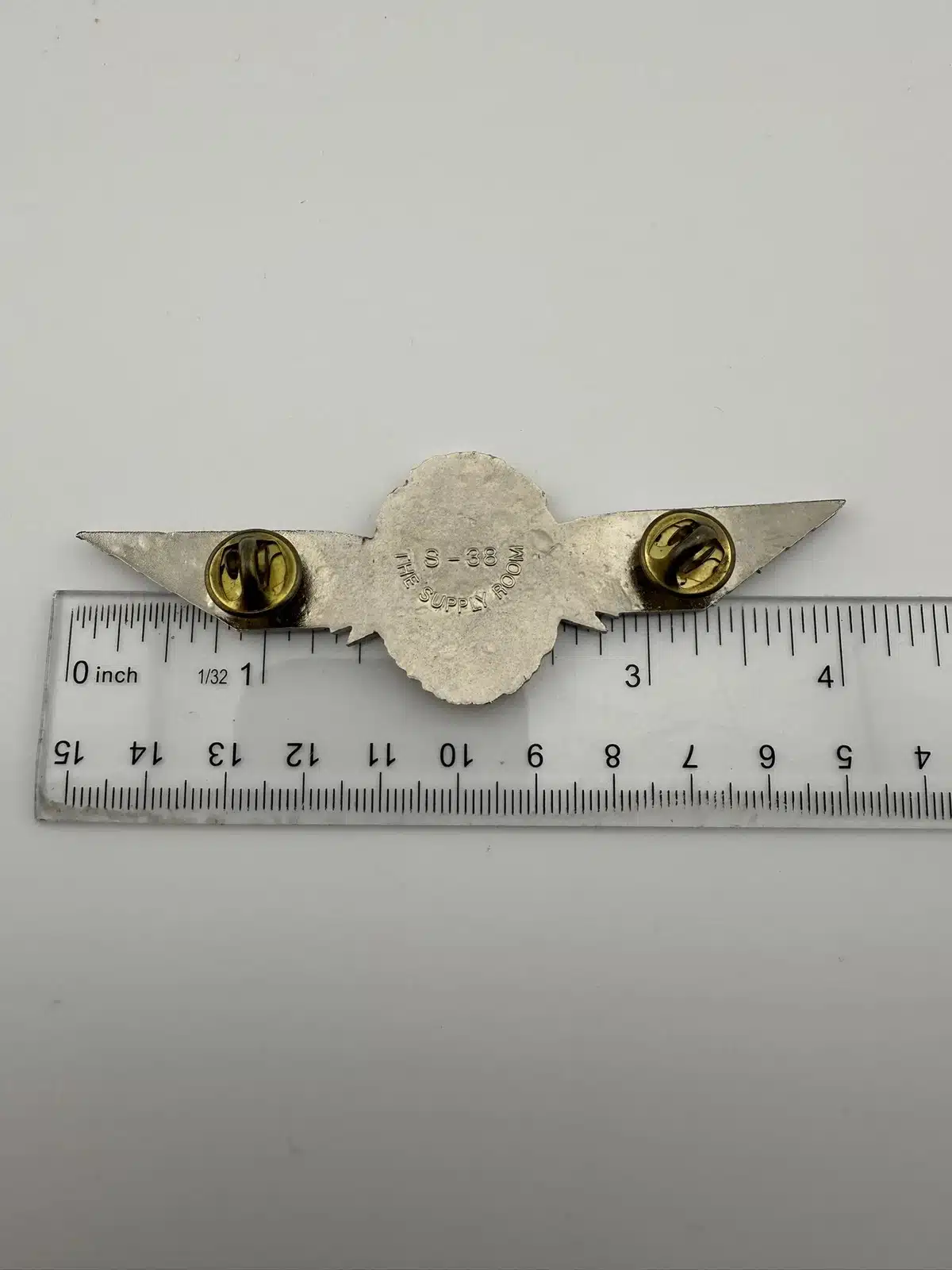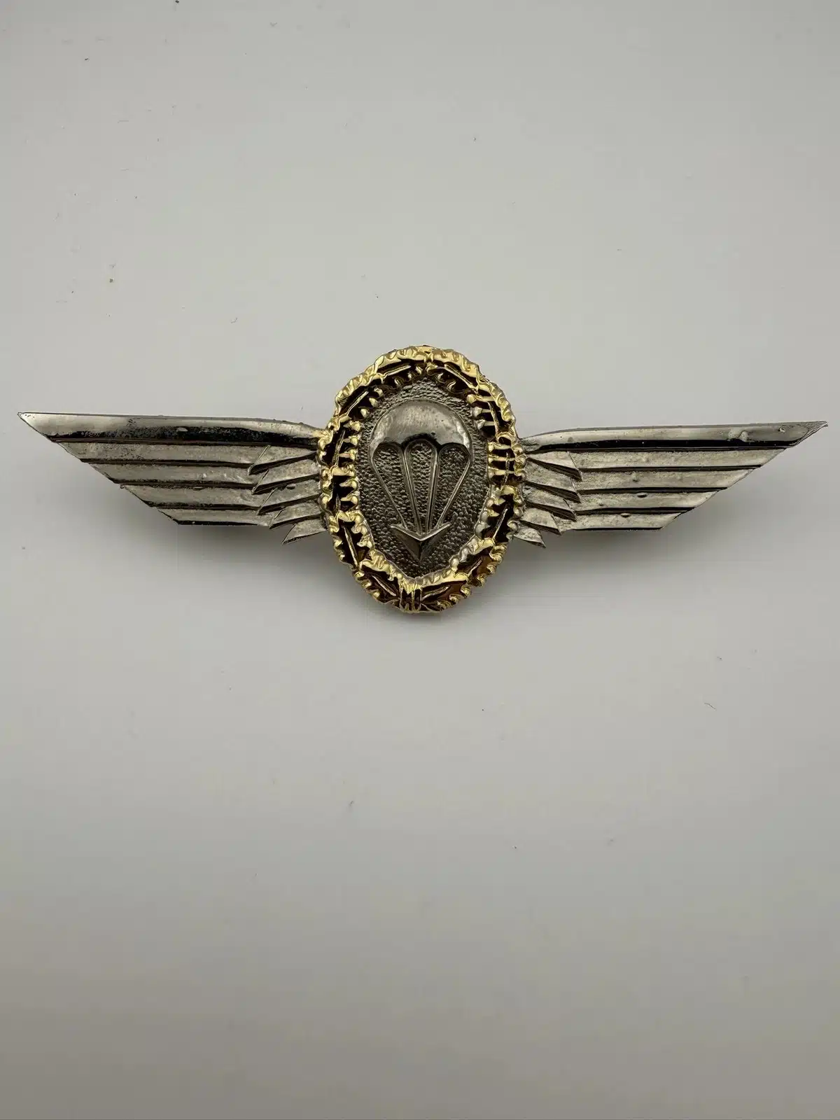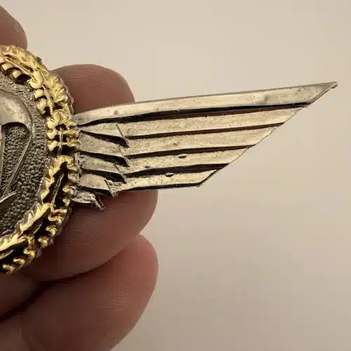 4″ wide replica of the German Armed Forces Parachutist Badge in silver and gold tones.