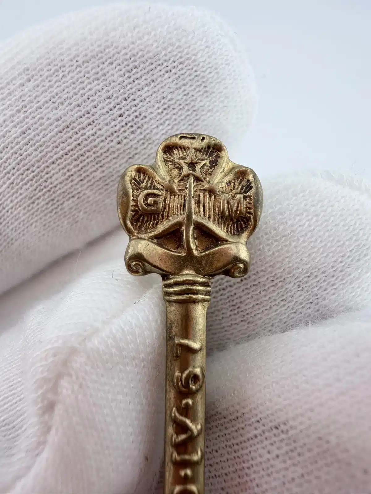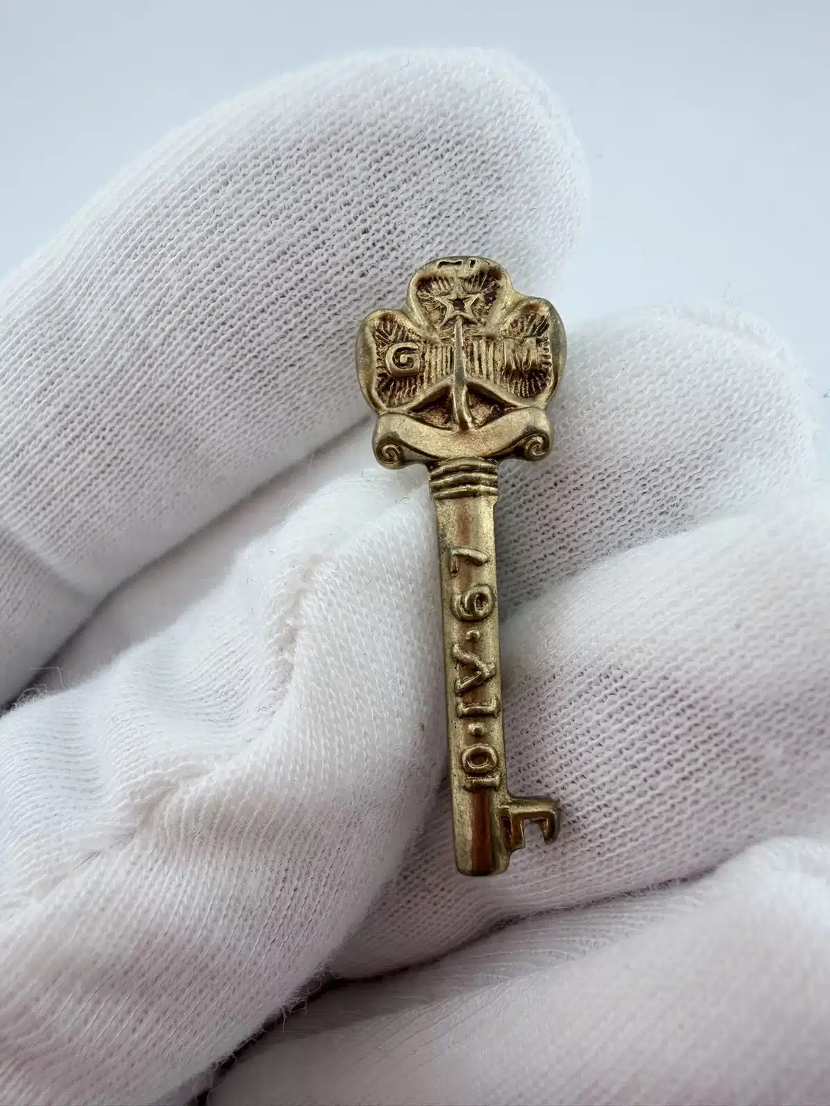 This pin is shaped like a vintage-style key in a gold tone finish, with the Girl Guides trefoil at the top marked with the letters GM. Along the shaft of the key are the characters 10.IV.67, forming a simple and distinctive commemorative design.