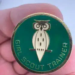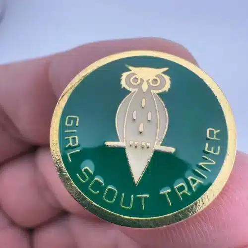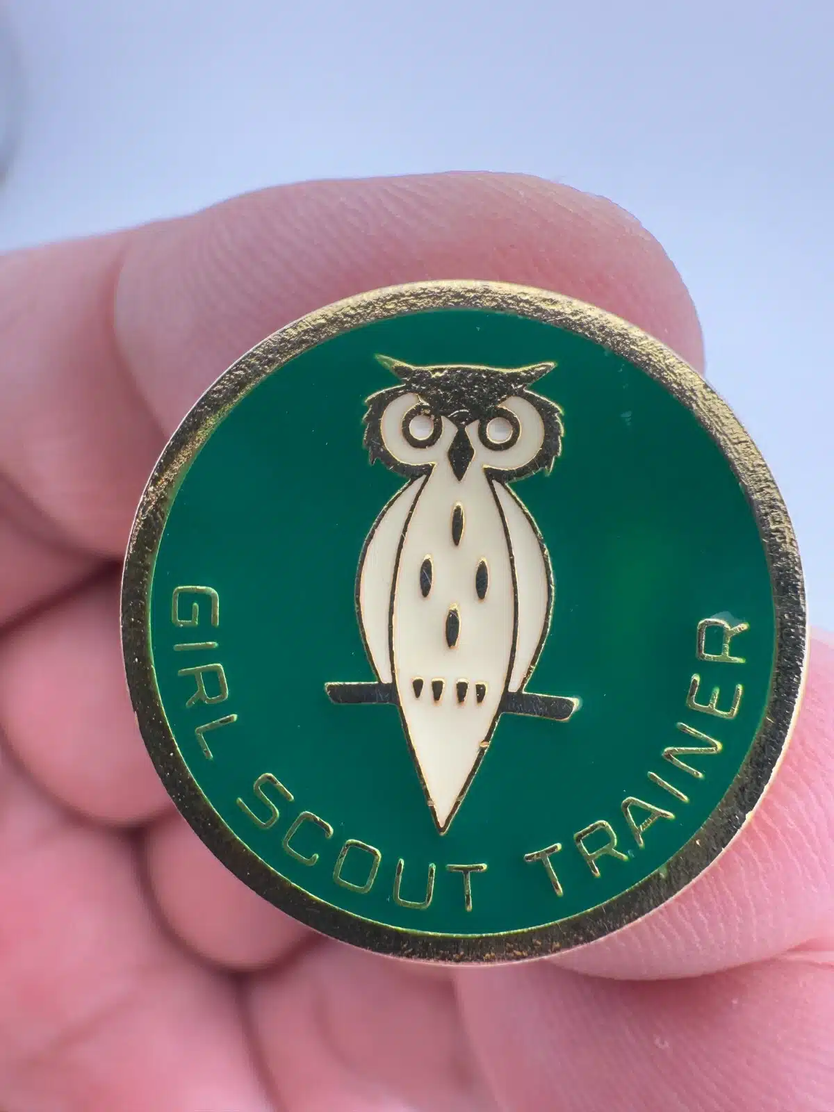 Girl Scout Trainer Lapel Hat Pin with Owl – Green and Gold Tone – RARE