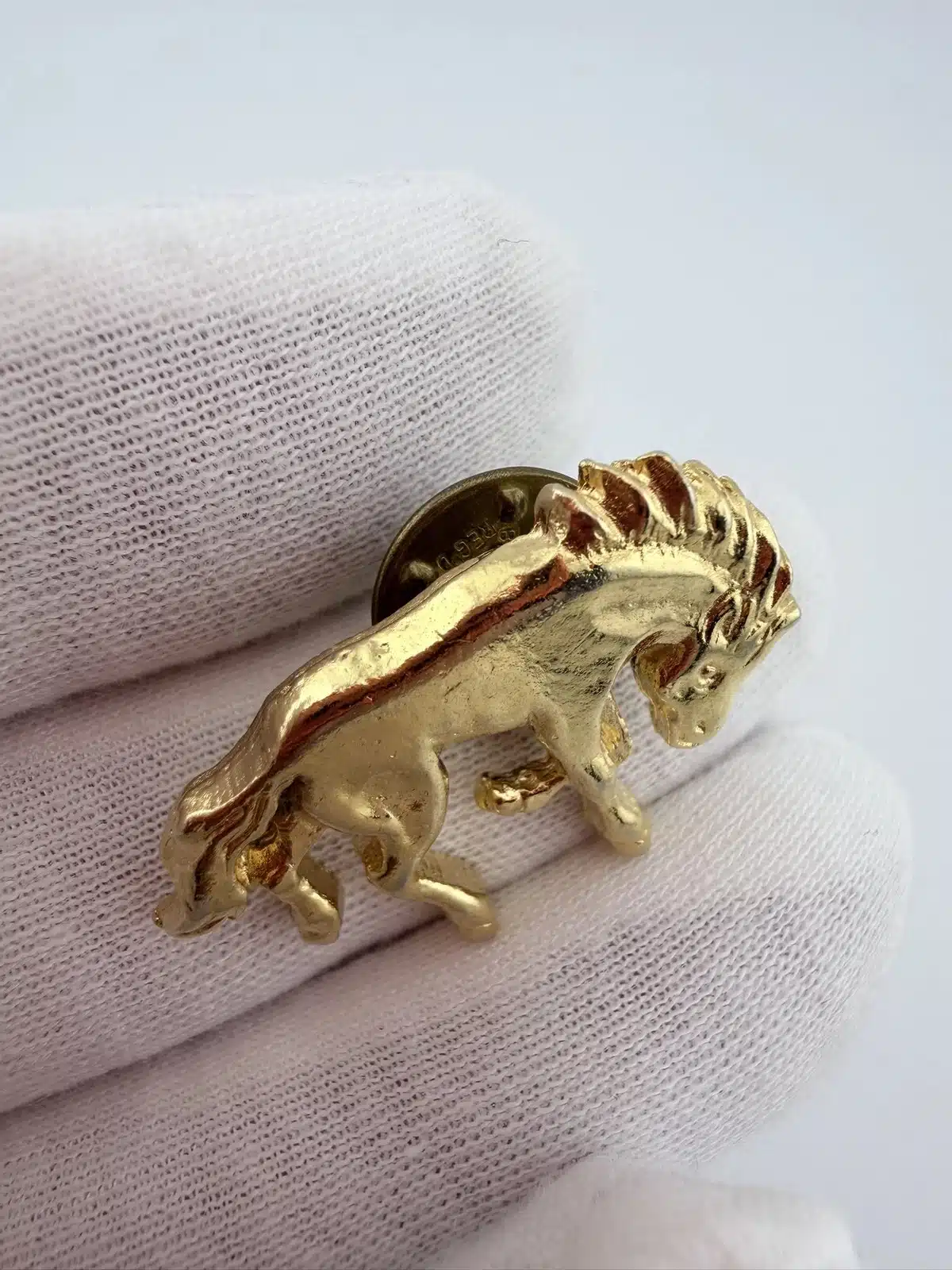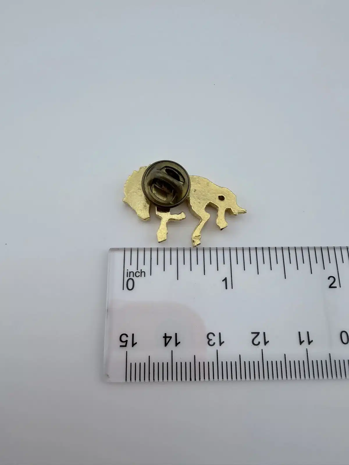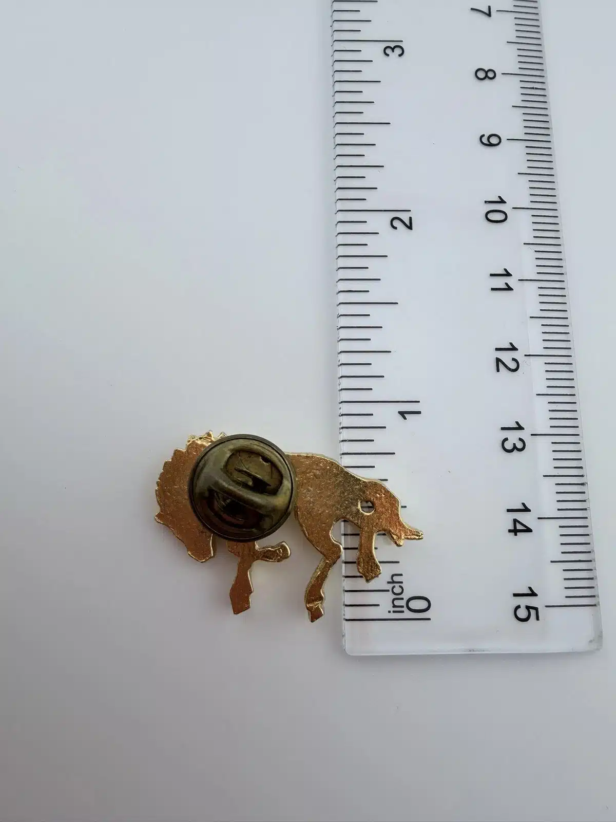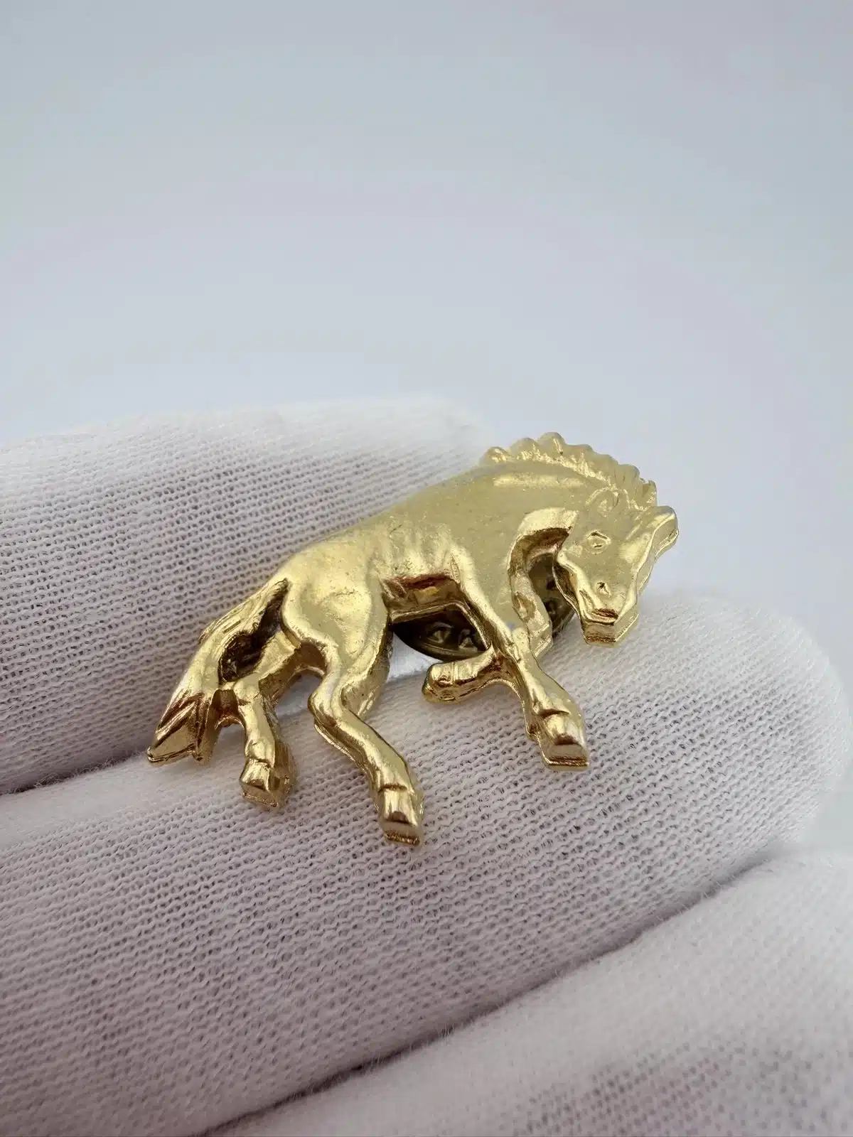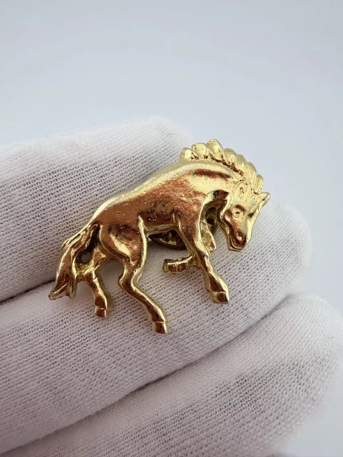 This gold tone lapel pin features a detailed depiction of a bucking horse, capturing the dynamic motion and spirit of rodeo culture. The design reflects the traditional Western heritage and is a nod to the significance of rodeo events in American history.