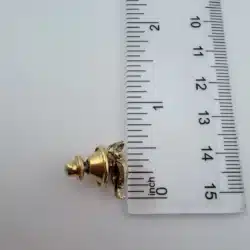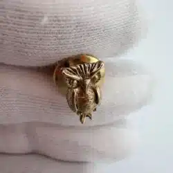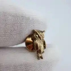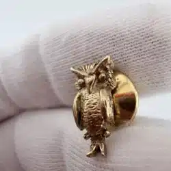 This gold tone tie tack features a meticulously crafted owl design, showcasing intricate detailing that highlights the bird’s feathers and expressive features. The tiny size adds a subtle charm, making it a distinctive accessory for any collection.