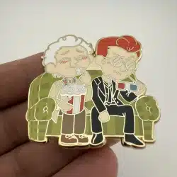 This fan-made lapel pin features Aziraphale and Crowley, the beloved characters from ‘Good Omens’, depicted in a whimsical design as they enjoy a 3D movie experience. The vibrant colors and playful imagery capture the essence of their unique friendship and the show’s blend of fantasy and humor.