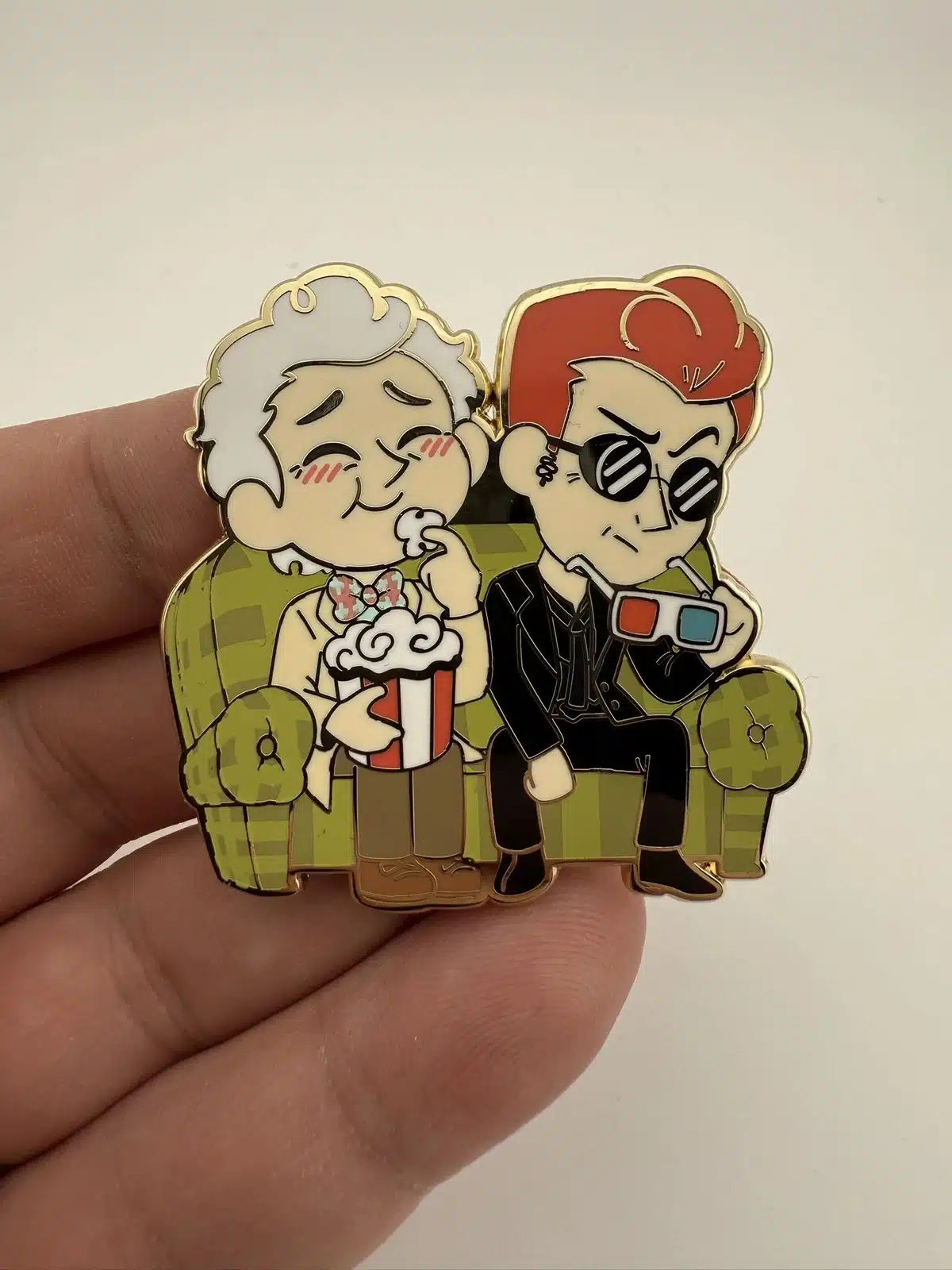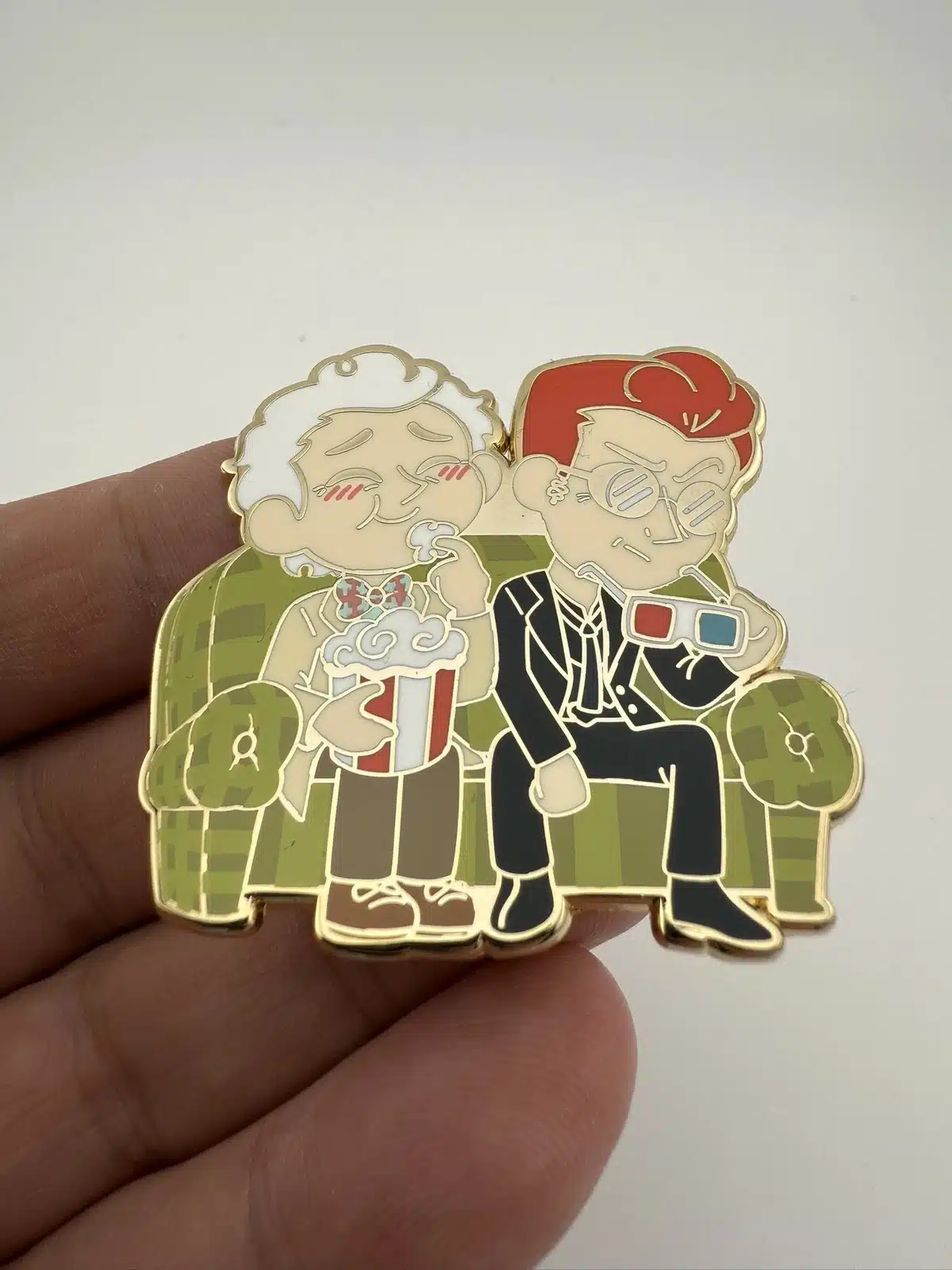 This fan-made lapel pin features Aziraphale and Crowley, the beloved characters from ‘Good Omens’, depicted in a whimsical design as they enjoy a 3D movie experience. The vibrant colors and playful imagery capture the essence of their unique friendship and the show’s blend of fantasy and humor.