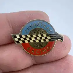 This 1988 pin features the iconic checkered eagle logo of Goodyear Racing, a symbol of speed and performance in motorsports.