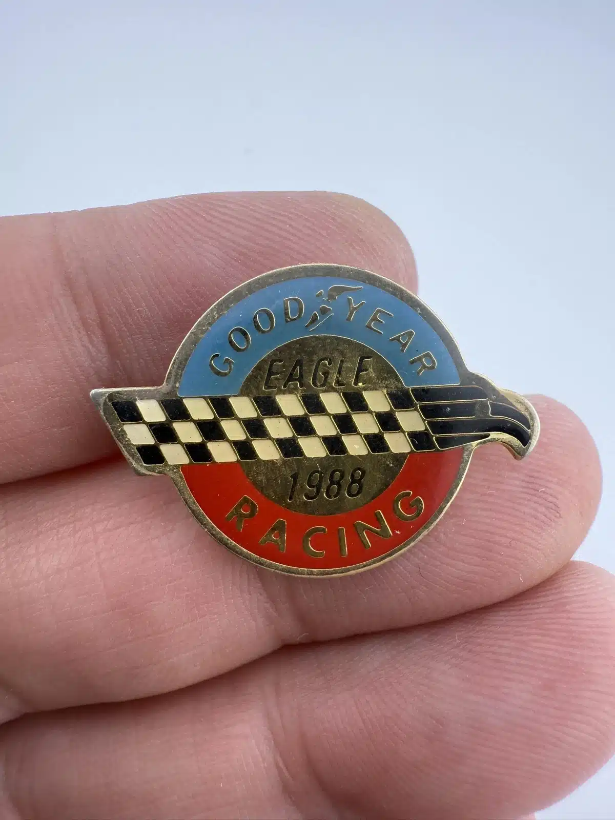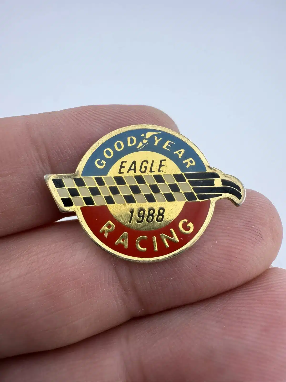 This 1988 pin features the iconic checkered eagle logo of Goodyear Racing, a symbol of speed and performance in motorsports.