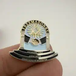 This lapel pin from the Grand Lodge of Washington, showcasing the iconic square and compasses symbol at top, a hallmark of Masonic tradition, along with hands shaking in the middle. Crafted with attention to detail, the design reflects the rich history and values of Freemasonry in Washington, emphasizing brotherhood and community service.