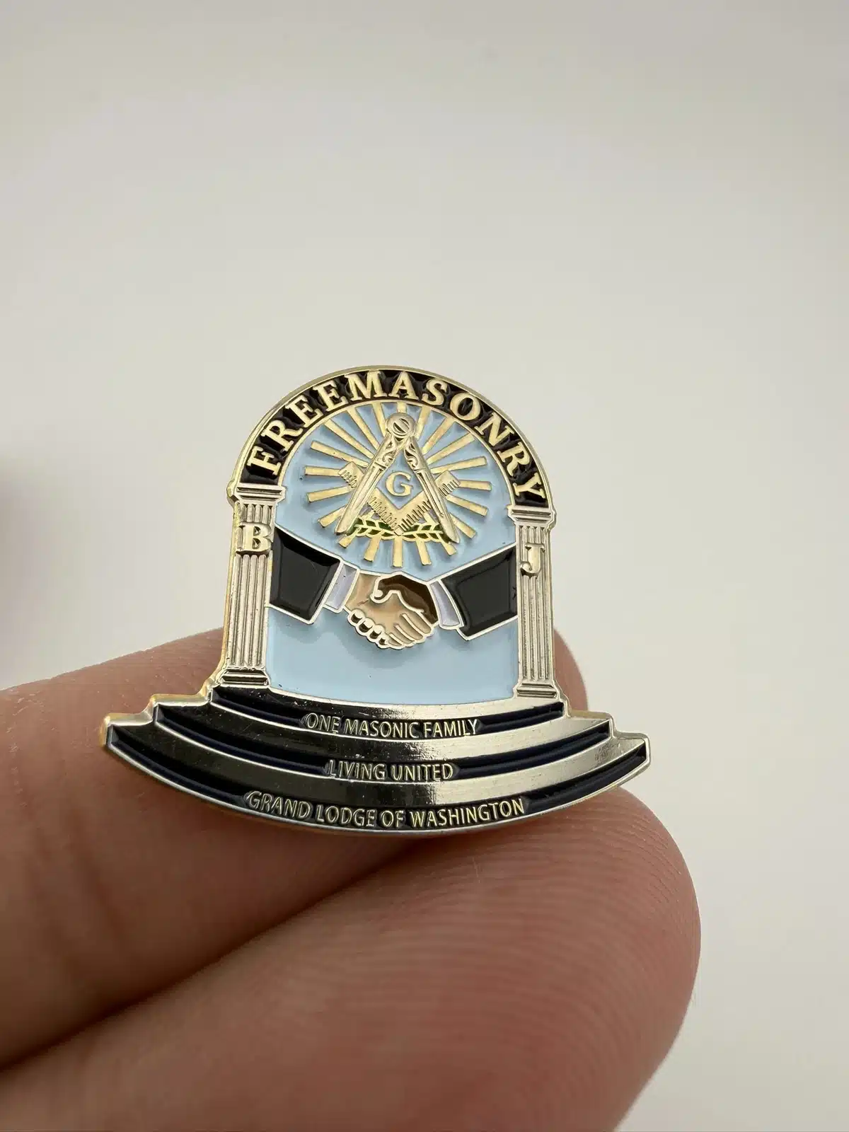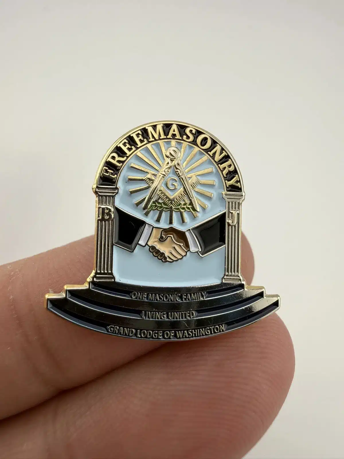 This lapel pin from the Grand Lodge of Washington, showcasing the iconic square and compasses symbol at top, a hallmark of Masonic tradition, along with hands shaking in the middle. Crafted with attention to detail, the design reflects the rich history and values of Freemasonry in Washington, emphasizing brotherhood and community service.