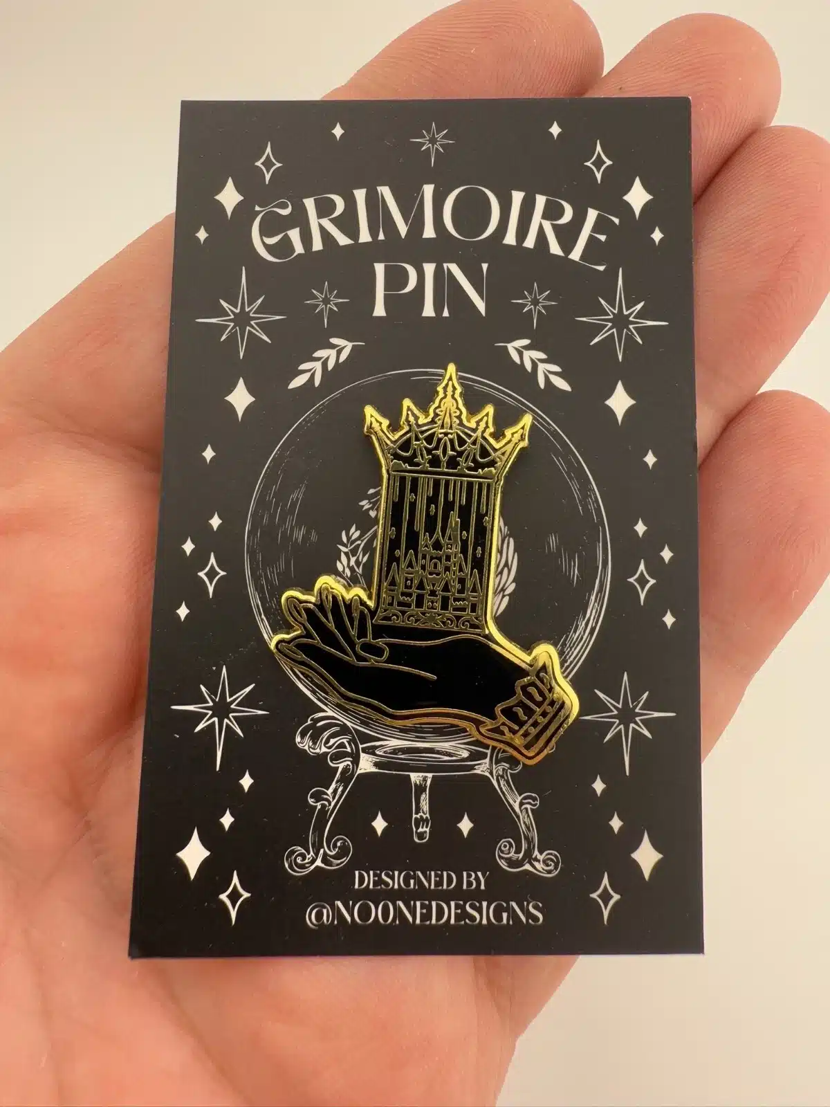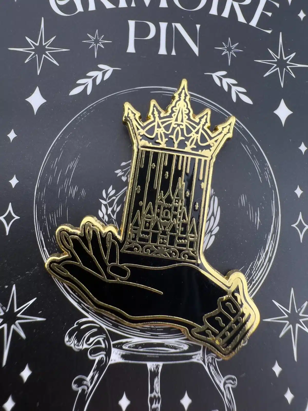 Grimoire Pin: Gilded Hand Holding Castle In A Cage Enamel Pin by NoOneDesigns
