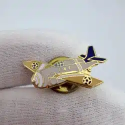 This lapel pin features the Grumman F4F Wildcat, a prominent fighter aircraft used by the United States Navy during World War II, depicted in a striking combination of yellow, white, and gray. The design captures the aircraft’s distinctive silhouette, reflecting its historical significance and role in naval aviation.