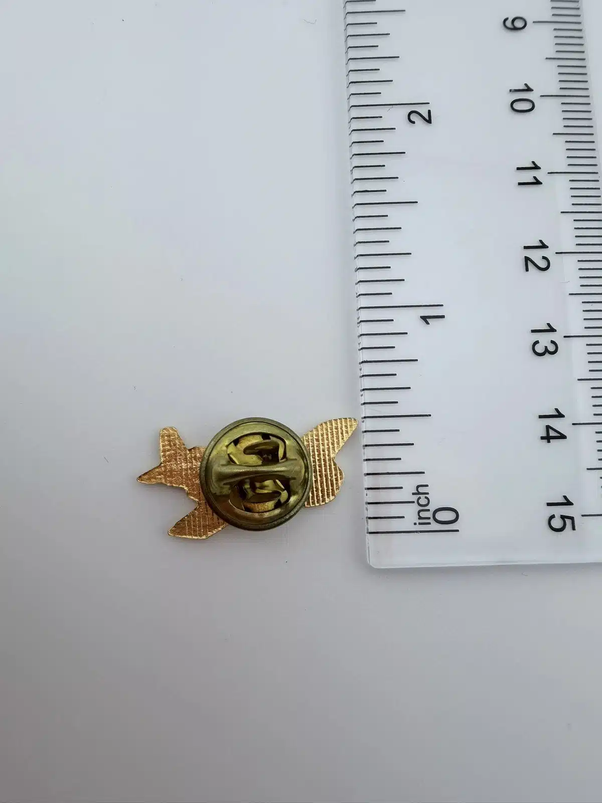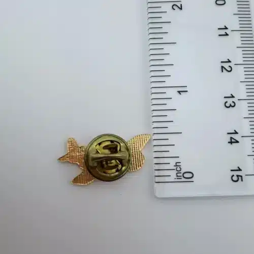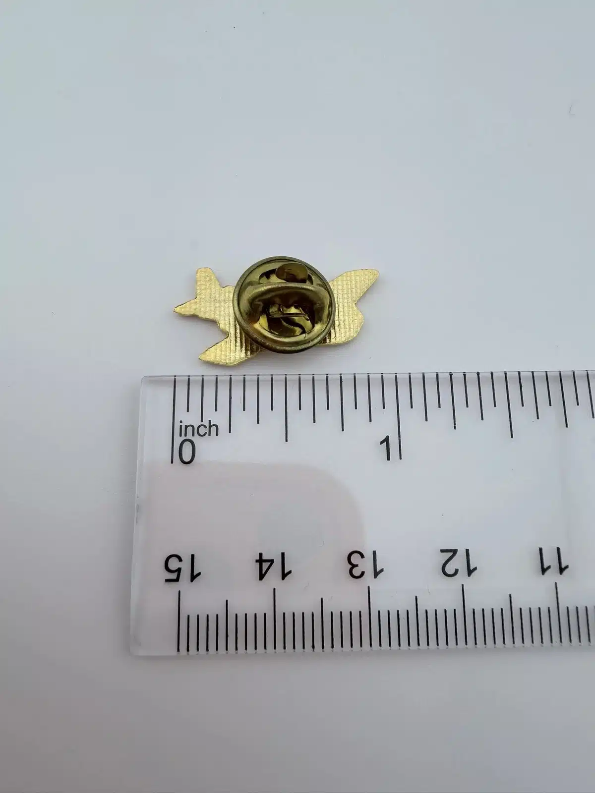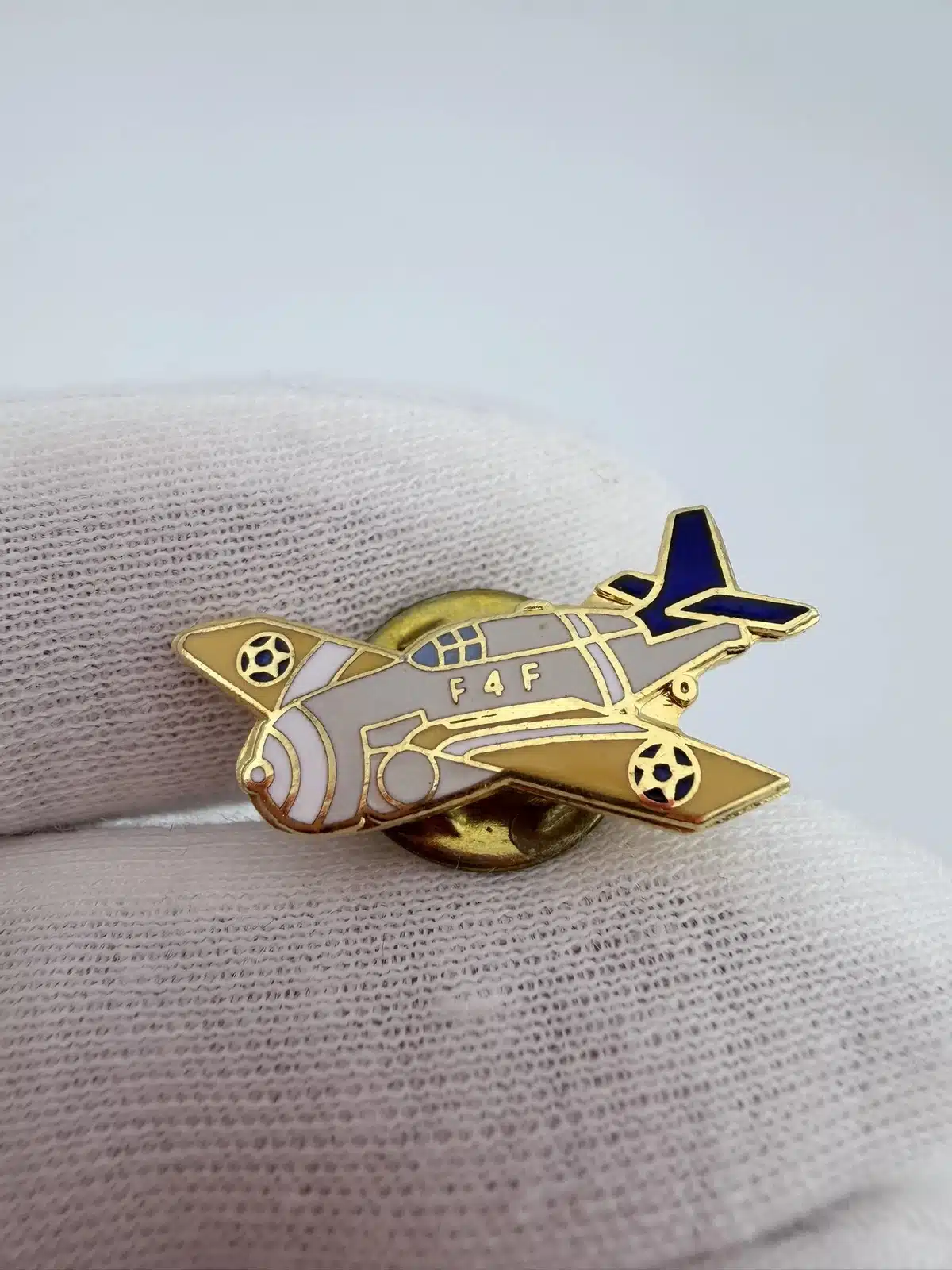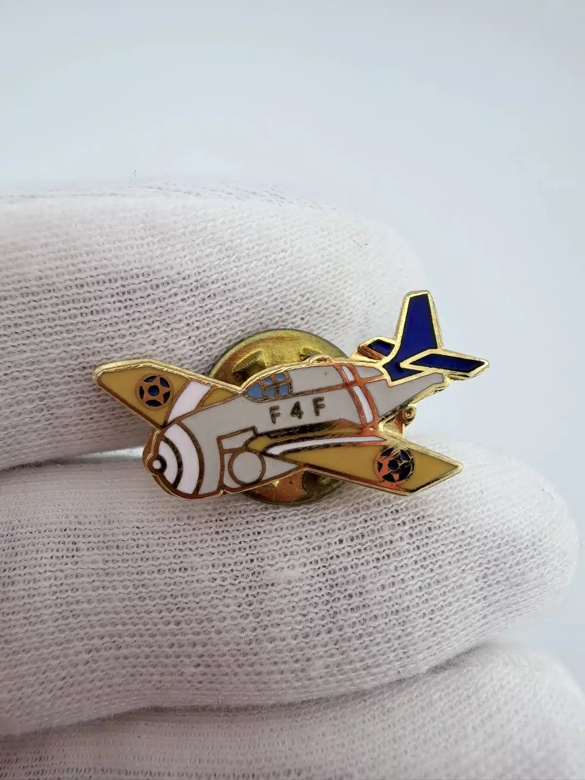 This lapel pin features the Grumman F4F Wildcat, a prominent fighter aircraft used by the United States Navy during World War II, depicted in a striking combination of yellow, white, and gray. The design captures the aircraft’s distinctive silhouette, reflecting its historical significance and role in naval aviation.