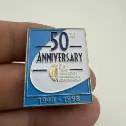 This lapel pin commemorates the 50th anniversary of the Helicopter Association International, featuring a design that incorporates the organization’s logo and a celebratory motif. The pin reflects the significance of the helicopter industry and its advancements over the past five decades.