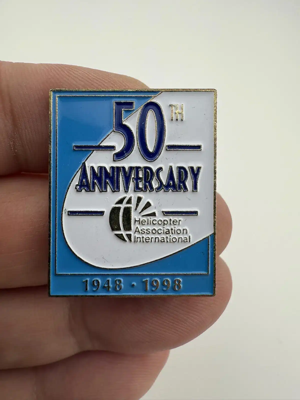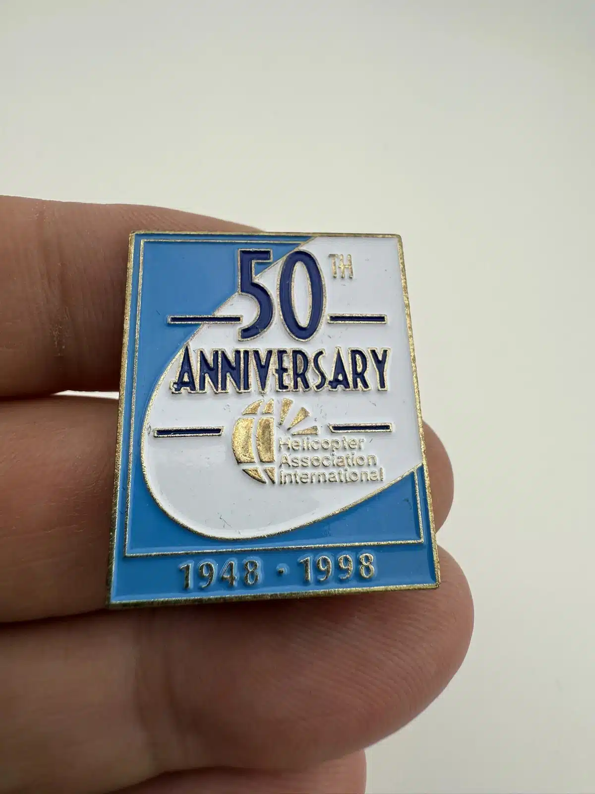 This lapel pin commemorates the 50th anniversary of the Helicopter Association International, featuring a design that incorporates the organization’s logo and a celebratory motif. The pin reflects the significance of the helicopter industry and its advancements over the past five decades.
