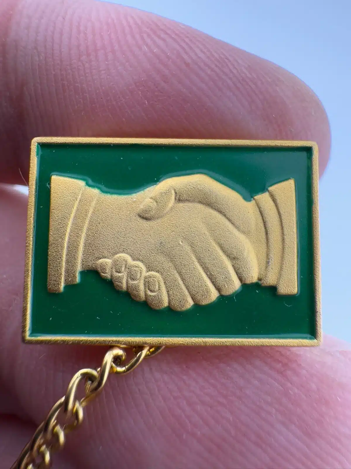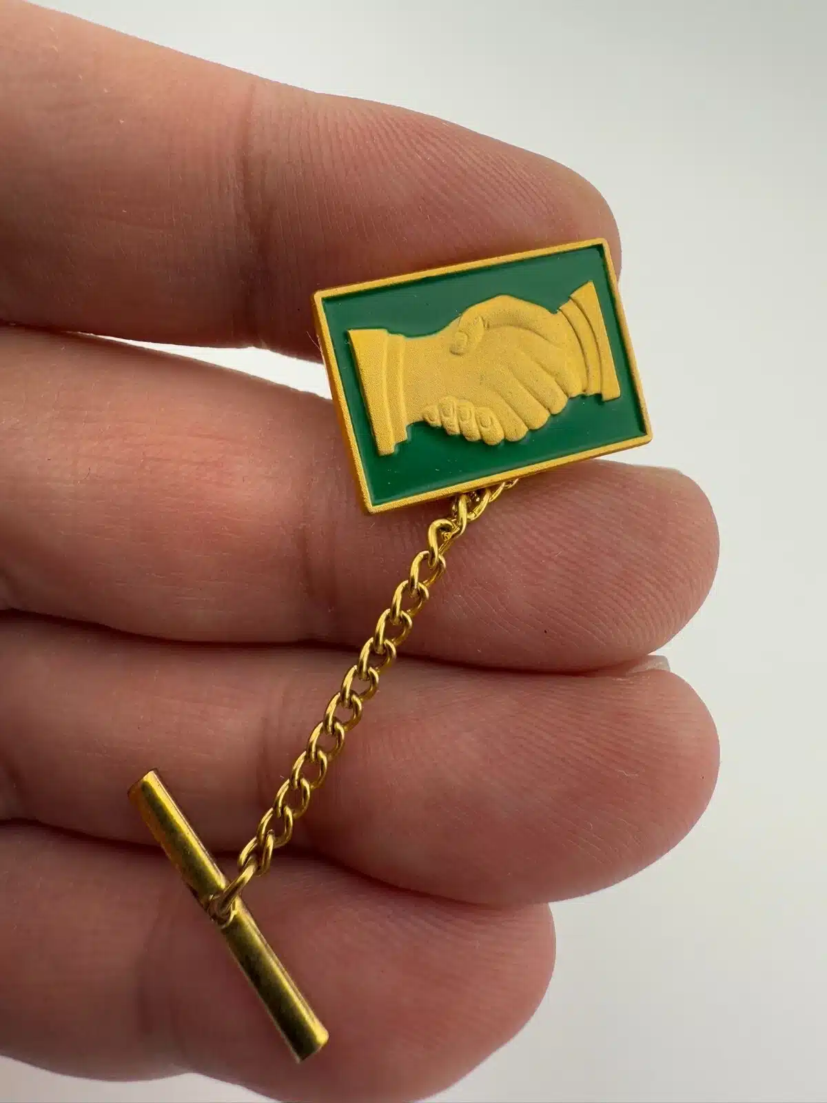 Hand Shake Tie Tack Pin – Gold Tone on Green Background – Nice Pin