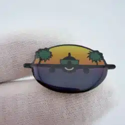 This whimsical pin features a cheerful airplane adorned with sunglasses, set against a backdrop of palm trees, capturing the essence of carefree travel and sunny destinations. The design evokes a sense of adventure and leisure, making it a delightful representation of aviation’s joyful spirit.