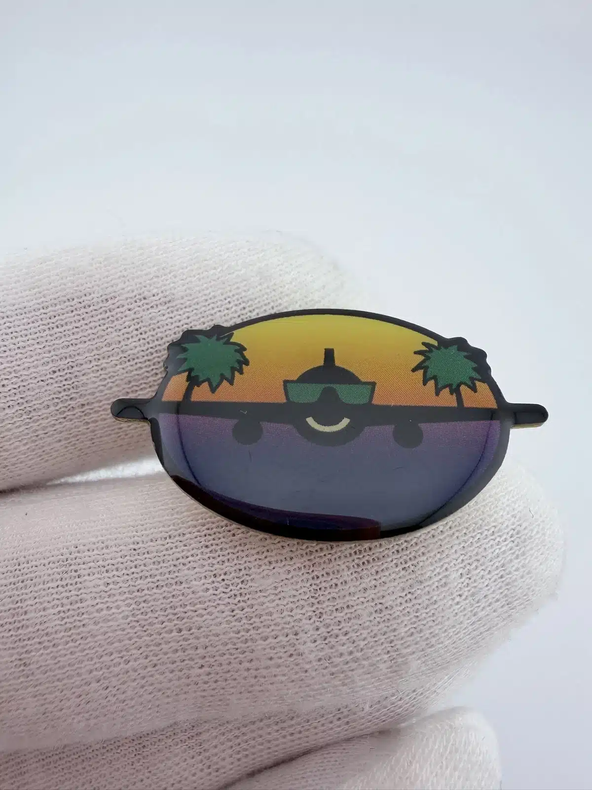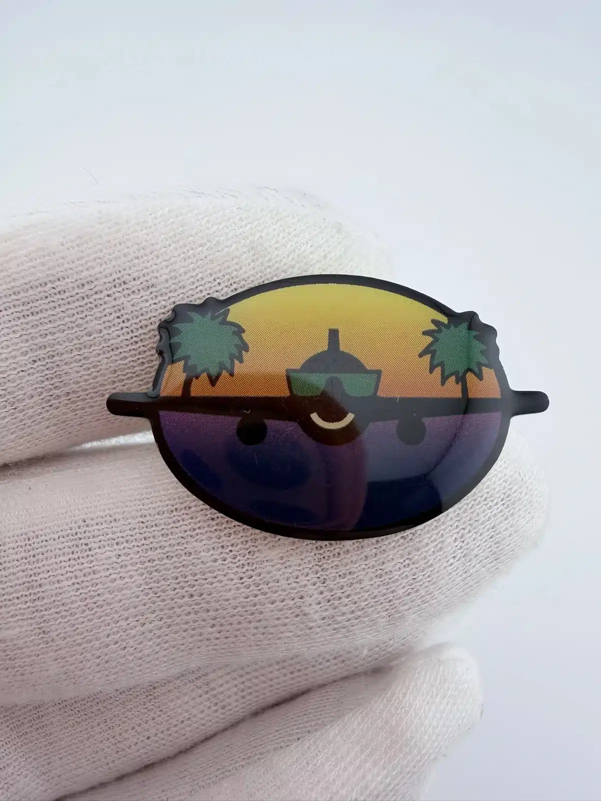 This whimsical pin features a cheerful airplane adorned with sunglasses, set against a backdrop of palm trees, capturing the essence of carefree travel and sunny destinations. The design evokes a sense of adventure and leisure, making it a delightful representation of aviation’s joyful spirit.