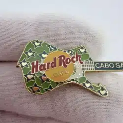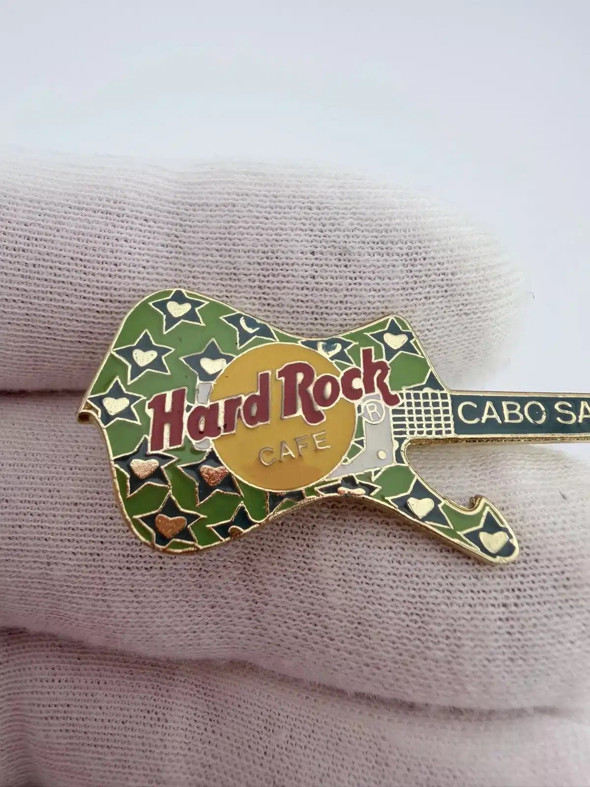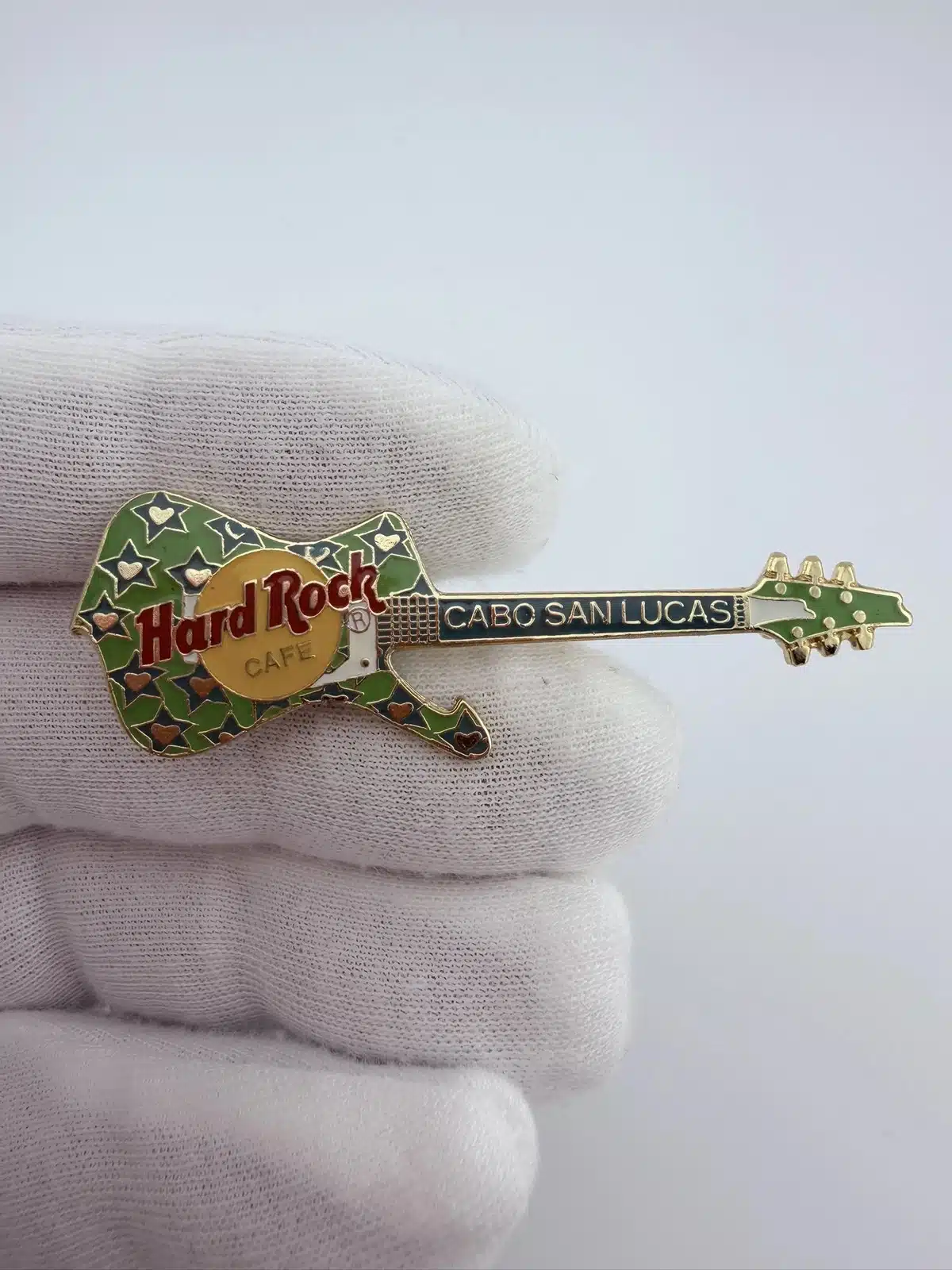 Modeled after the distinctive Ibanez Iceman guitar shape, this Hard Rock Cafe Cabo San Lucas pin features a green guitar design accented with decorative stars containing small hearts. The stylized instrument continues Hard Rock’s tradition of city-specific guitar pins tied to its global restaurant locations.