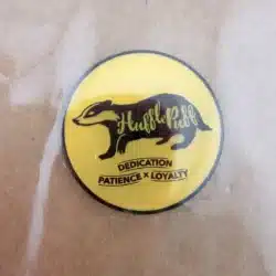 This Hufflepuff badge pin features a striking yellow background with a central badger, symbolizing the house’s values of dedication, patience, and loyalty. The word ‘Hufflepuff’ is prominently displayed on the badger’s, making this pin a vibrant tribute to one of the four houses at Hogwarts School of Witchcraft and Wizardry. Pin measures approximately 1 inch in diameter.